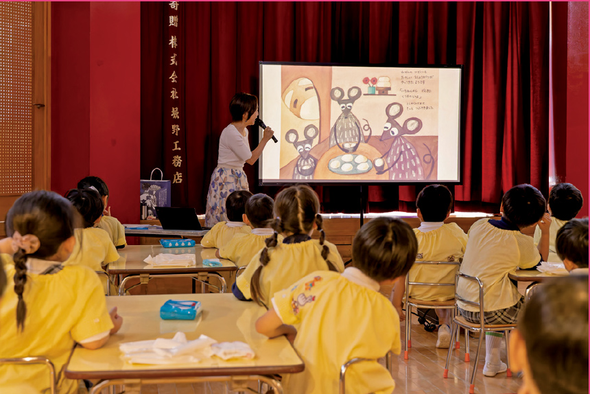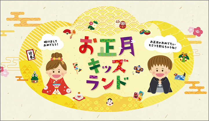 キュートなネズミのキャラクターが出てくる絵本にみんな真剣。お正月に飾るものや食べるもの、新しい年の幸せをもたらす「としがみさま」について学びました。「お正月キッズランド」では動く絵本劇場を楽しめます。