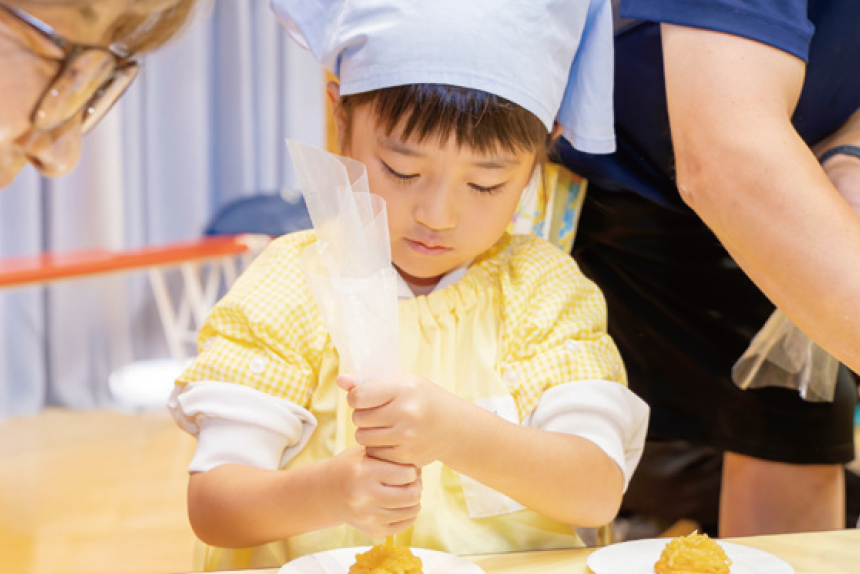 クラッカーに栗きんとんを載せ、その上から、絞り袋にいれたあんを渦状に絞っていきます。作業しながら子どもたちの「楽しい」の声がたくさん。