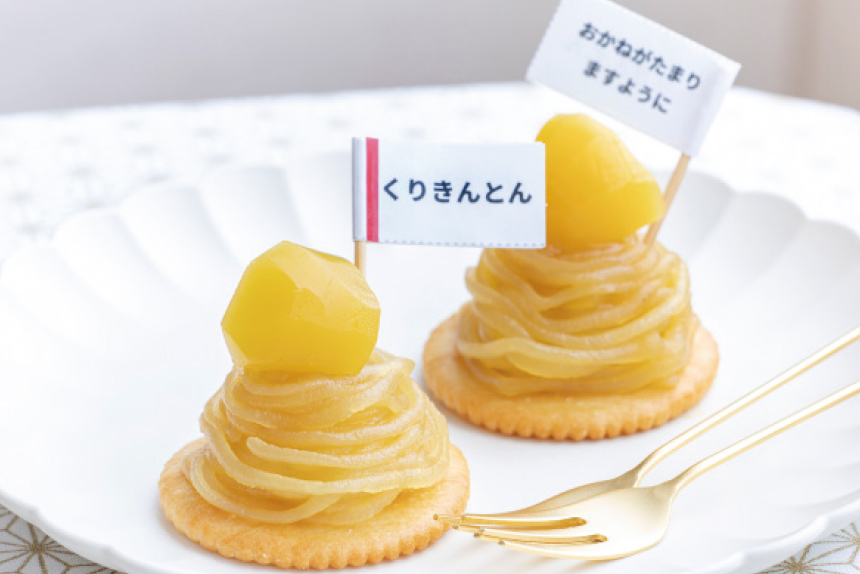 栗をトッピングしてかわいらしく仕上がりました。今回は、表に料理名、裏に料理の意味が書かれた「ピック」も飾り付け。ピックは「お正月キッズランド」からダウンロードできます。