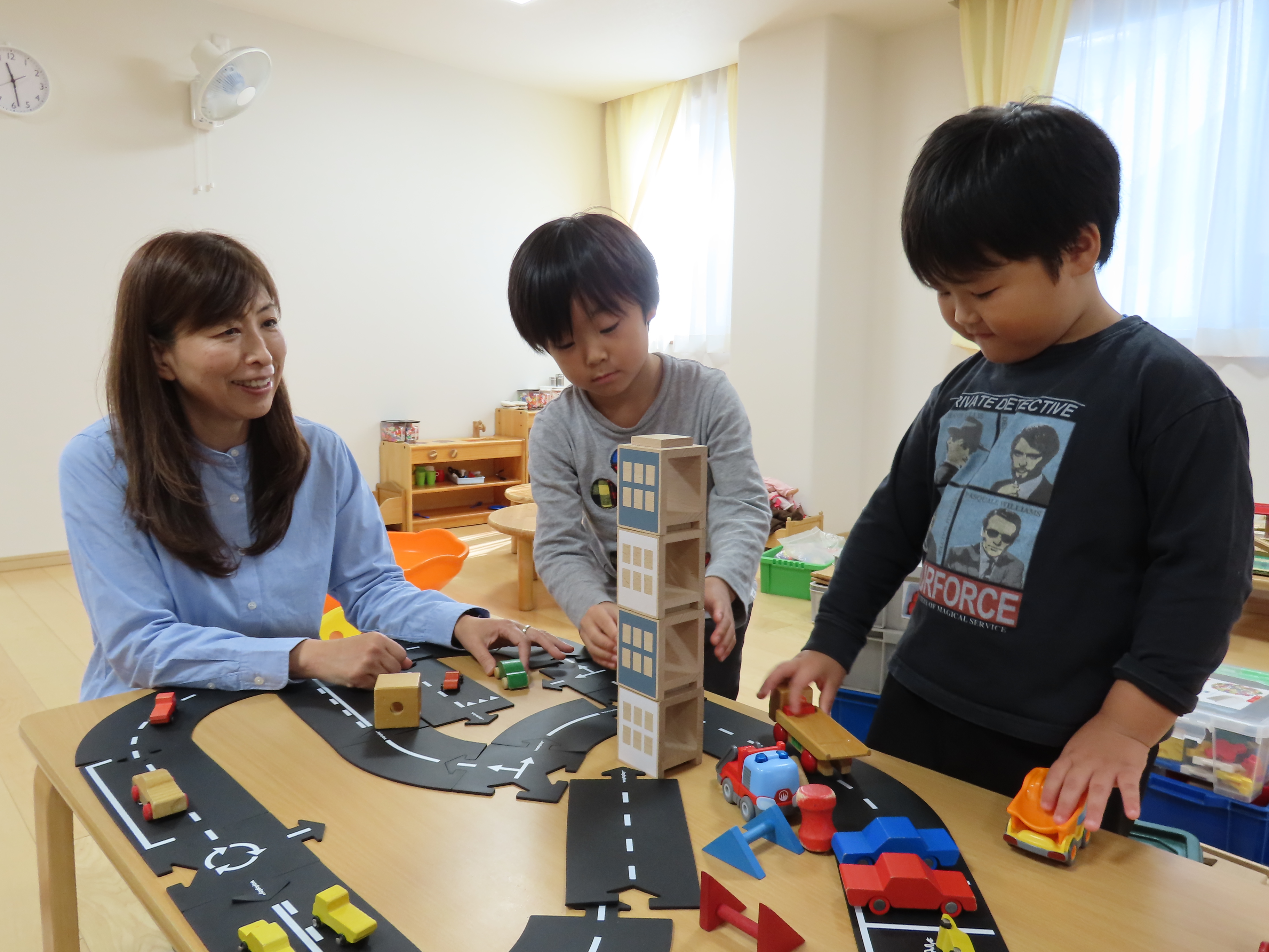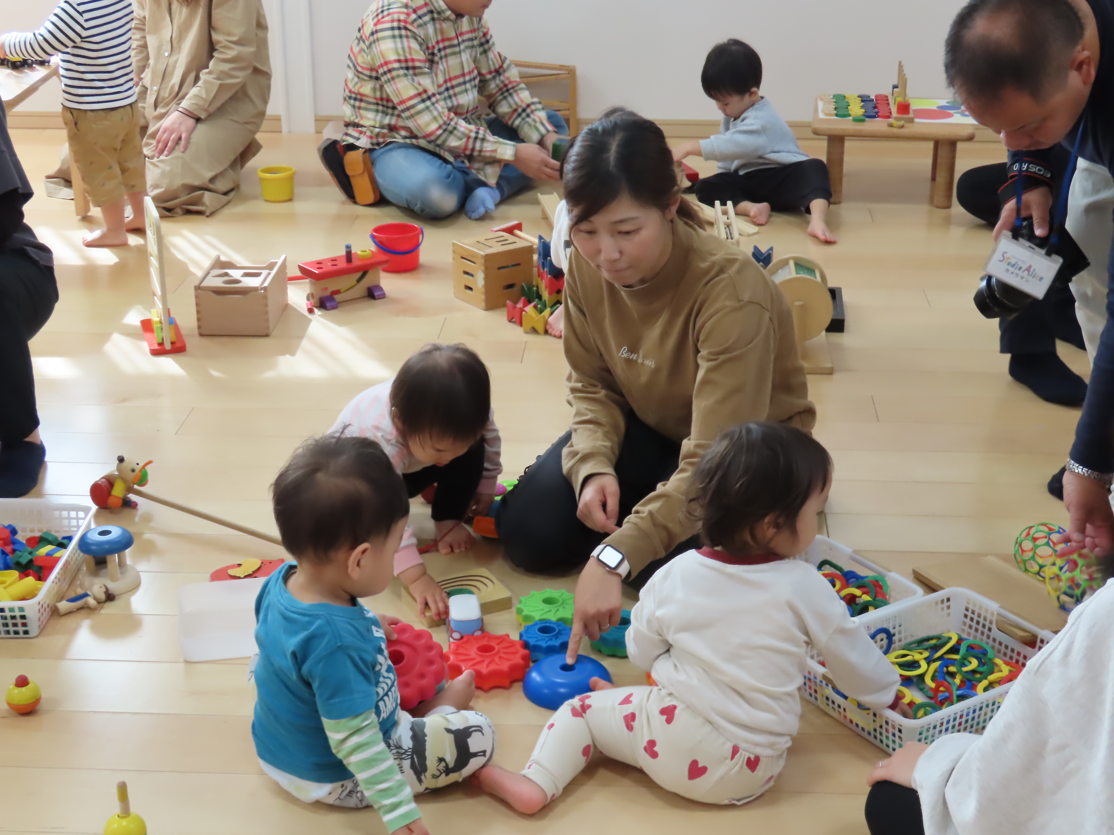 年に2回、木のおもちゃの専門店がたくさんのおもちゃを持ってこられる「おもちゃライブラリー」の日に行うこともあります。園開放は、保護者支援の場でもありますので「大人と話したい」という方には交流の時間を、「相談したい事がある」という方には職員との時間を設けるなど柔軟に対応しています。来園される方にとってほっとできる時間になっていればうれしいですね。