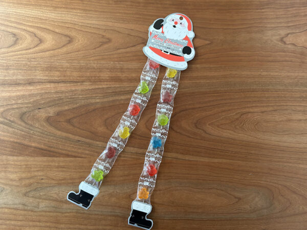 足長サンタのカラフルグミ。グミ自体もツリーやジンジャーマンなどのクリスマスモチーフです。壁などに吊るして飾ったり、ツリーに飾ってもかわいい!