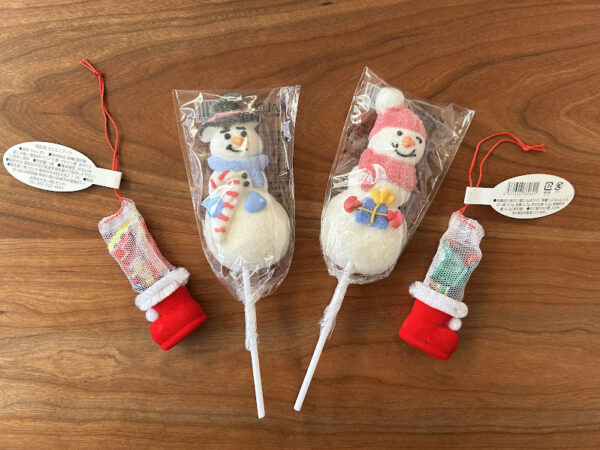おとぼけな表情がかわいいマシュマロロリポップは瓶やカップなどに入れて飾ってもGOOD。ミニミニサンタブーツはツリーの飾りにしたり、プレゼントに添えたりしてもいいですね!