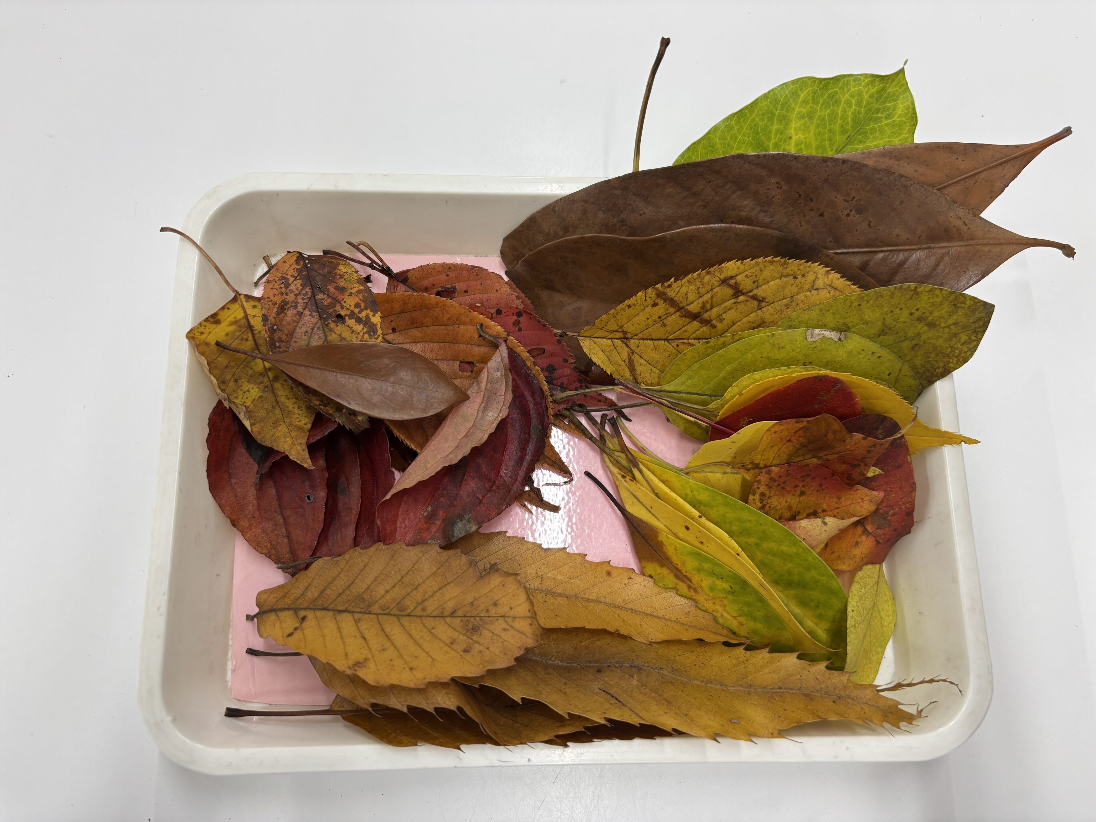 モンテッソーリ教育には、幼児期の色彩への興味に寄り添った「色板」という教具があります。同じ色のペアを見つけたり、微妙な濃淡の違いをグラデーションに並べたりすることで、子どもたちは自然と色の世界に没頭します。まるで美しい絵の具パレットを眺めるときのような高揚感──「うわぁ、きれい!」という声が思わずこぼれる瞬間。落ち葉遊びも、この“色を味わう感性”をしっかり育んでくれる活動です。