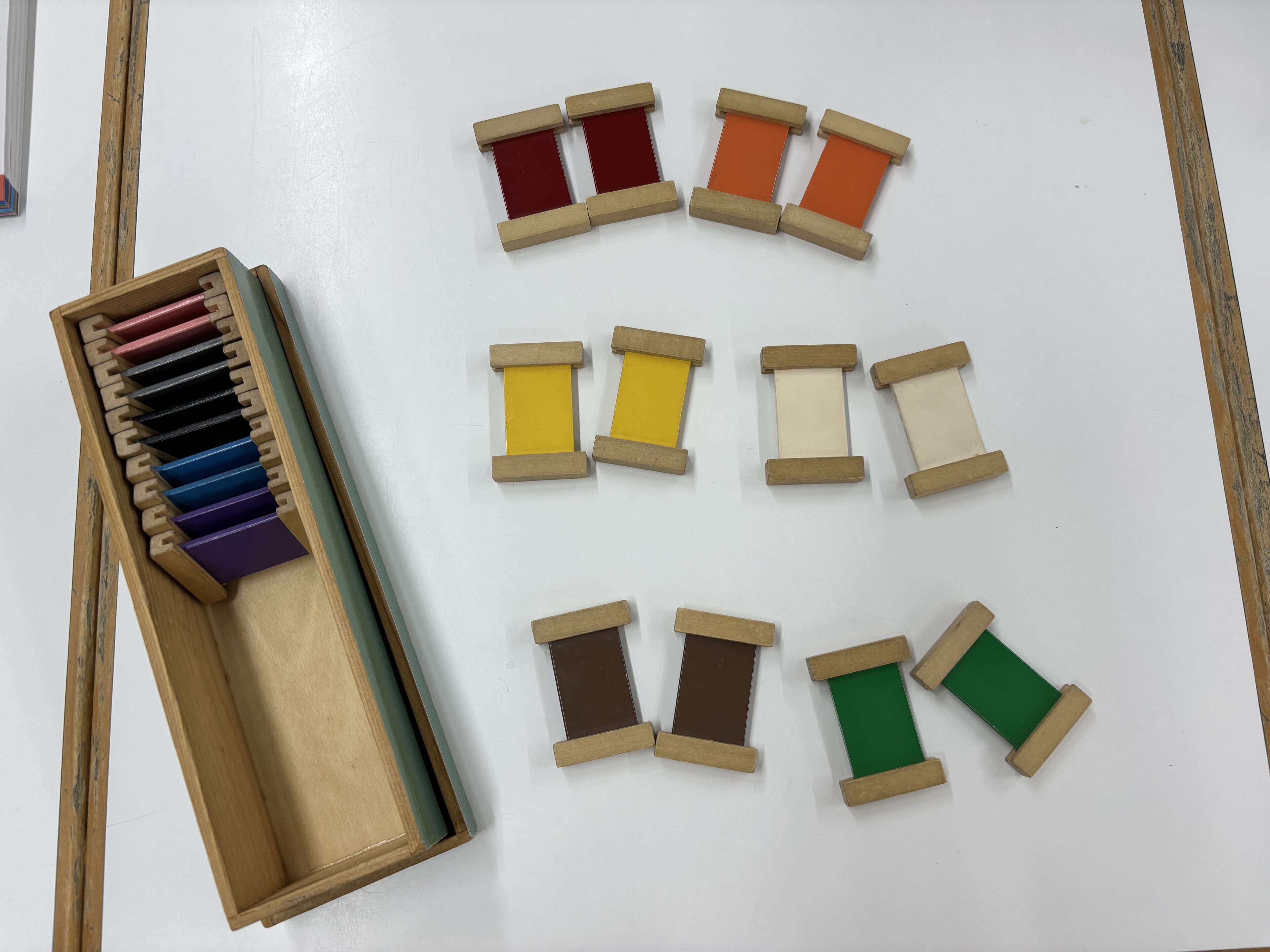 モンテッソーリ教具の11色の色板。各色2枚ずつ箱に入っており、同じ色を見つけてペアにしたり、色の名称を紹介します。