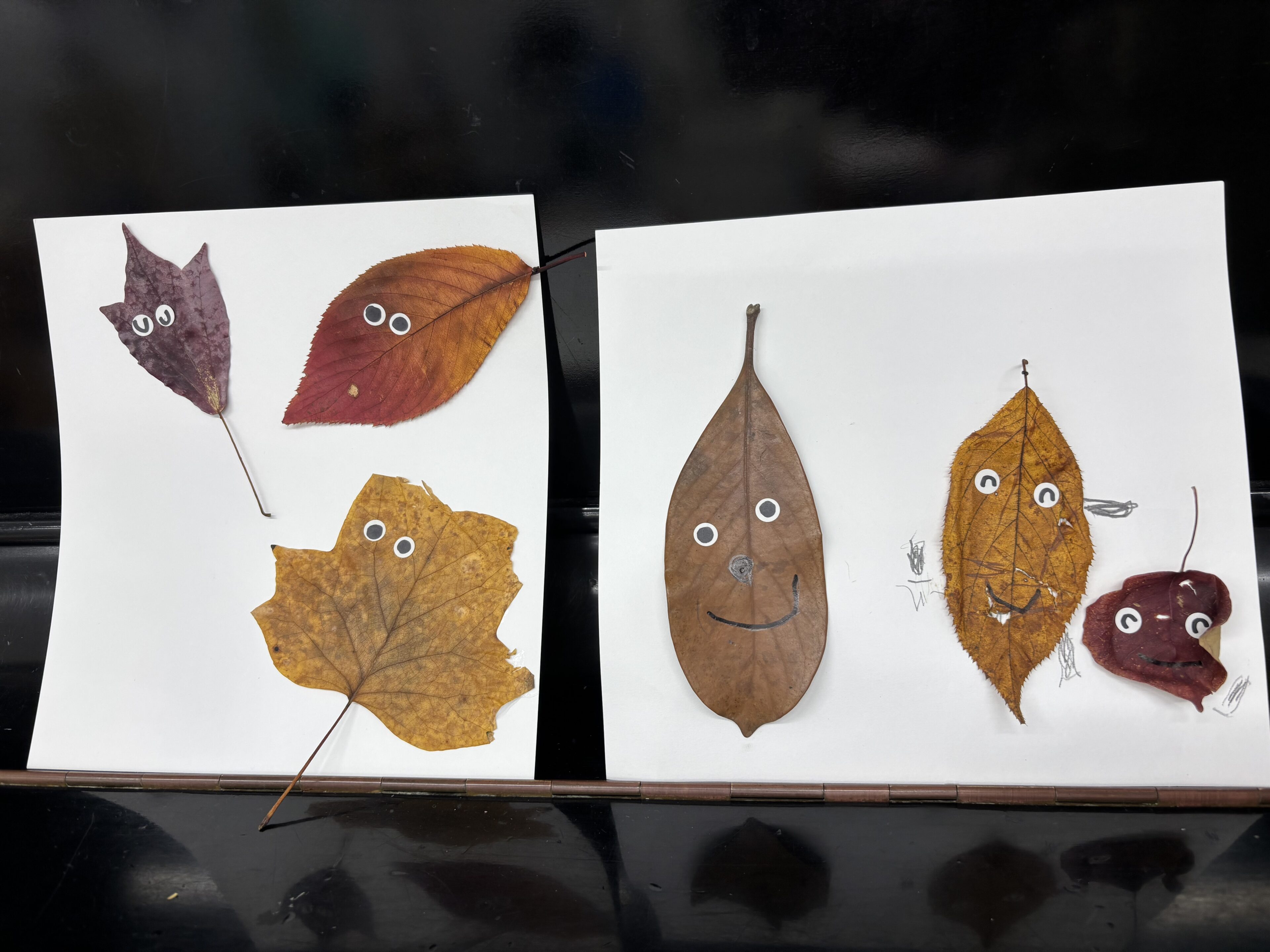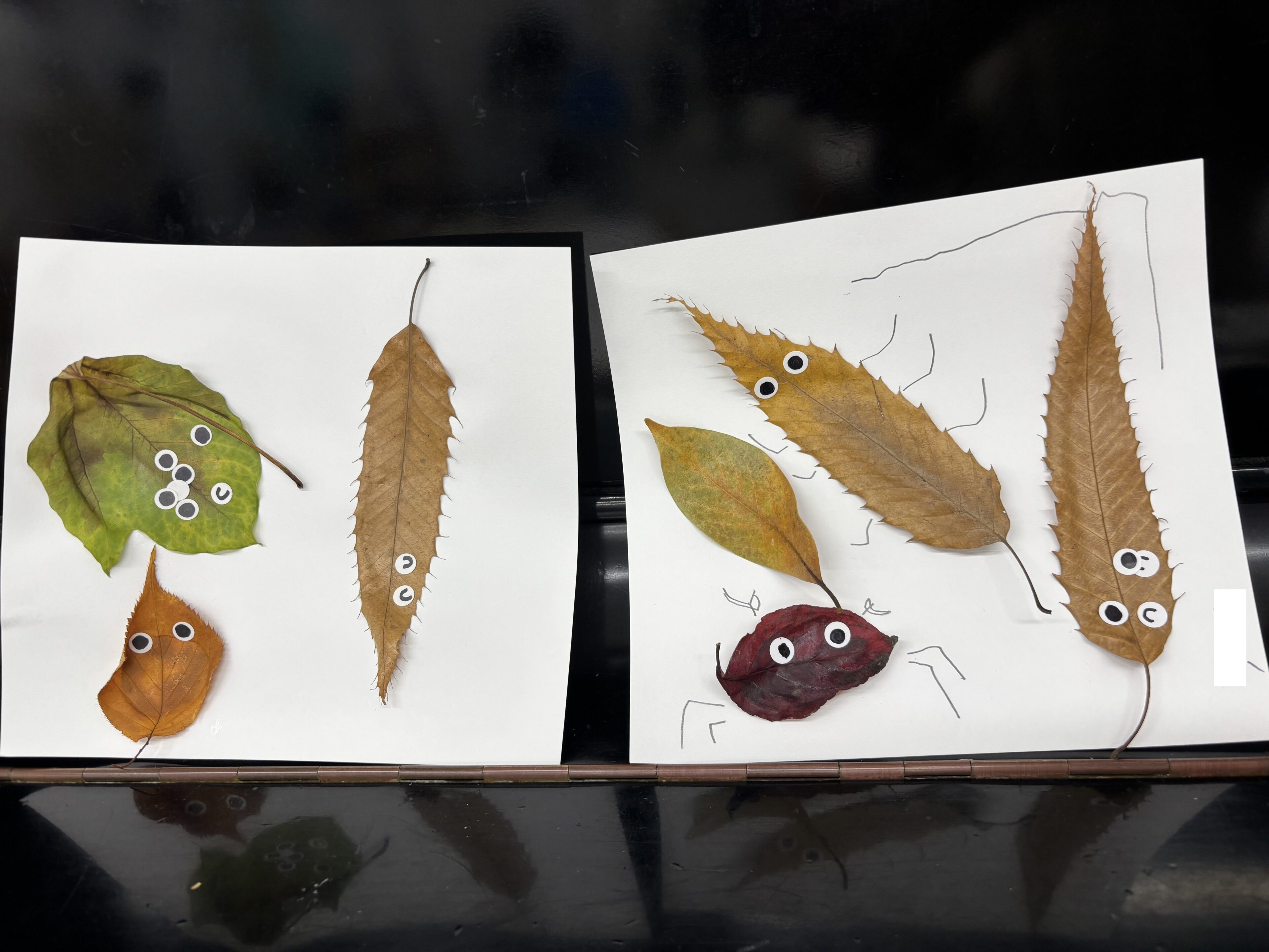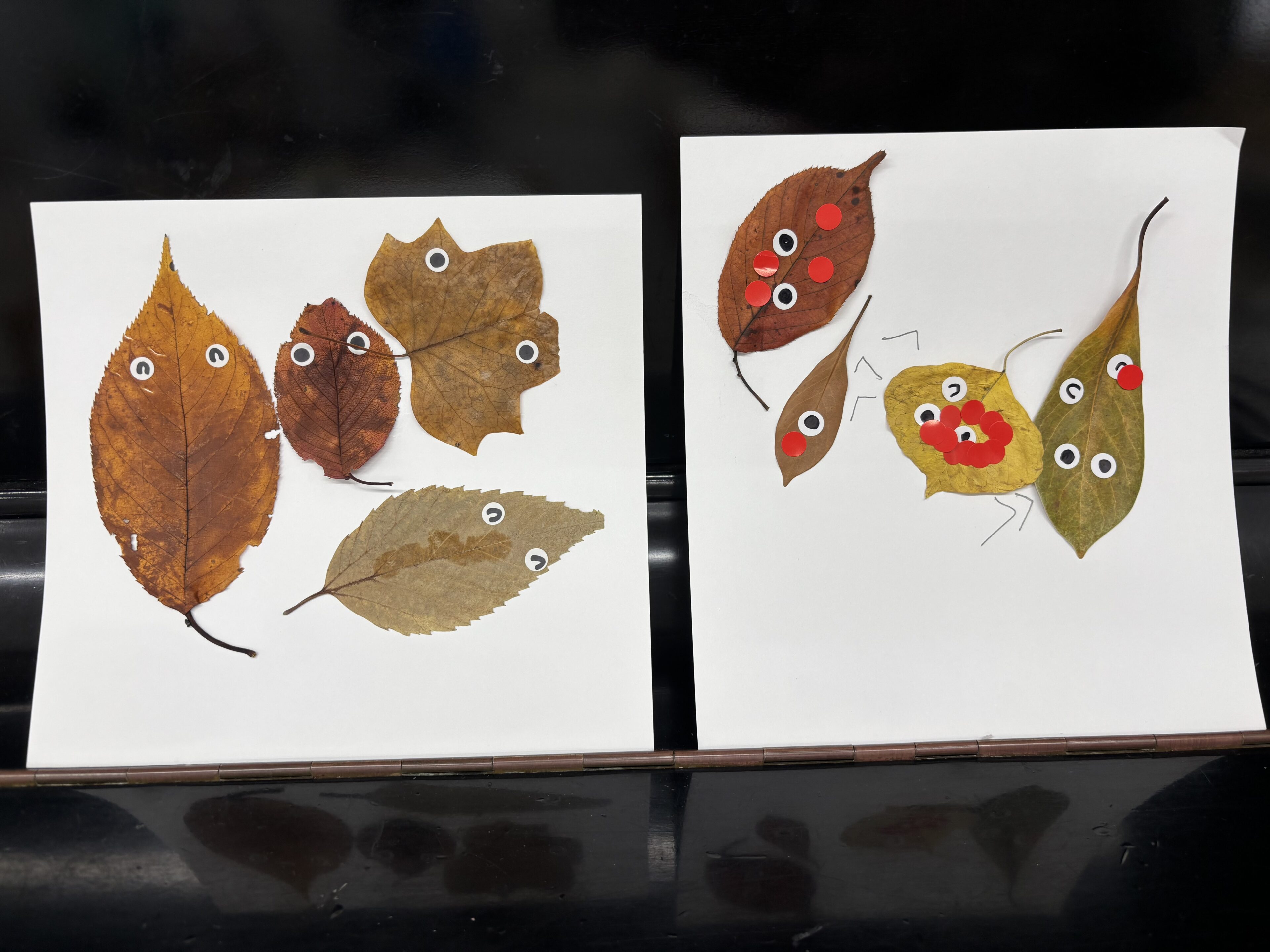 今回は、公園で拾ってきた落ち葉を紙に好きなように並べ、シールの目玉をつけるだけのシンプルな制作。それだけなのに、仕上がった作品はどれもかわいい生き物のようです。