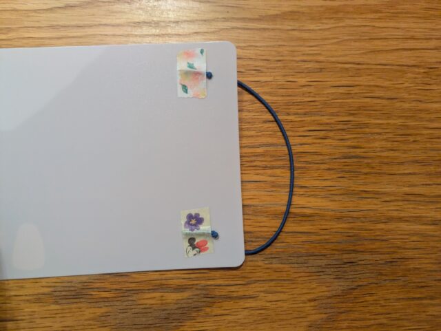 立体シールを貼るとバインダーが開きがちなので、ブックバンド(ヘアゴムOK)を付けるのがおすすめ。裏面にキリで穴をあけてゴムを結び付けます。