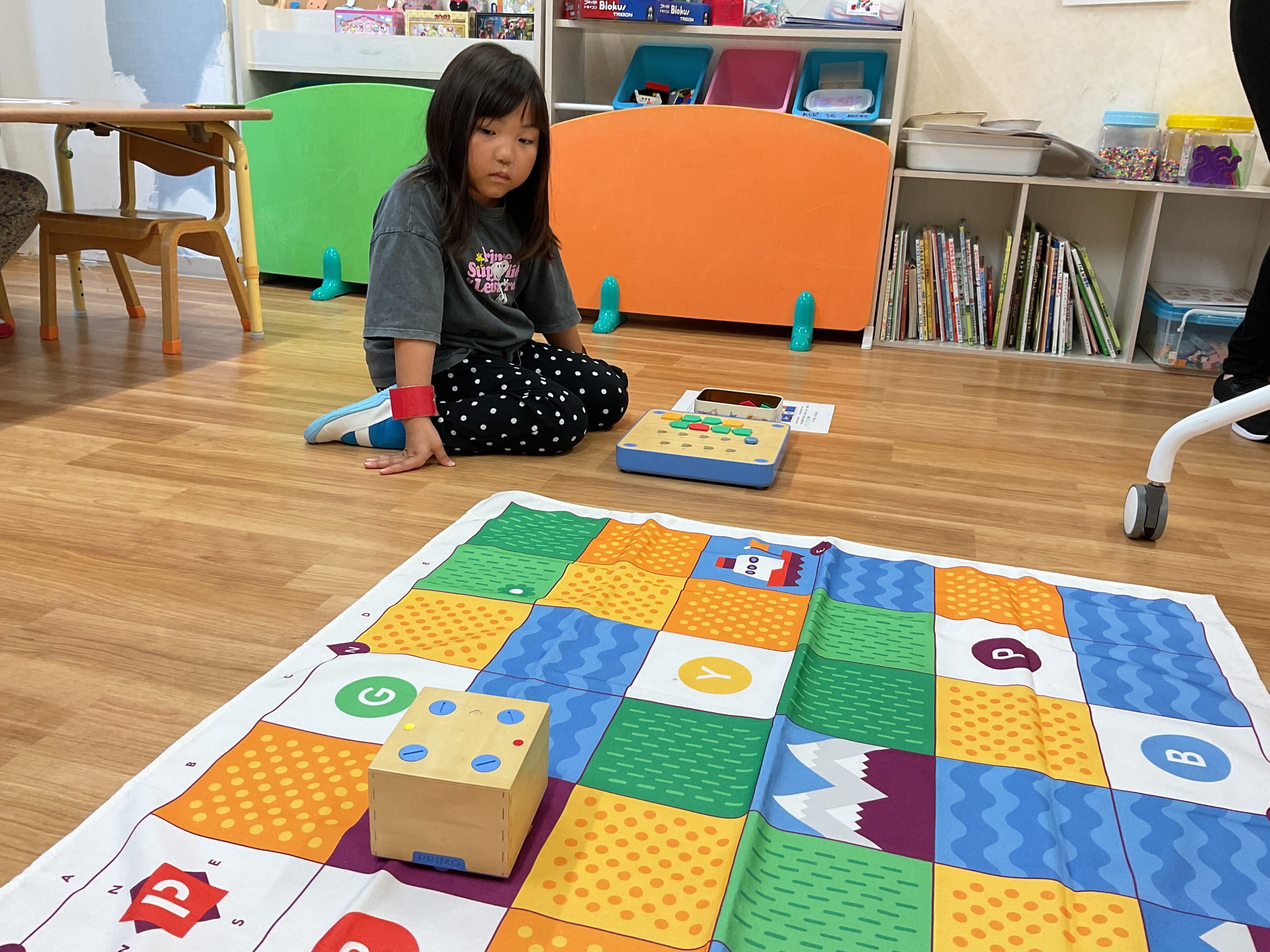 4歳児と5歳児向けに、月に1~2回の「プログラミングレッスン」もあります。パソコンを使うのではなくて、物の仲間分けをしたり、幼児用の教材ロボットを使ってレッスンを行うこともあります。レッスンを通して考える力を養い、間違ったとしてもあきらめずに再度考える問題解決力を育んでいきます。友達と意見交換をしながらグループで取り組むこともあり、幼児期の終わりまでに育てたい“協同性”にもつながっています。