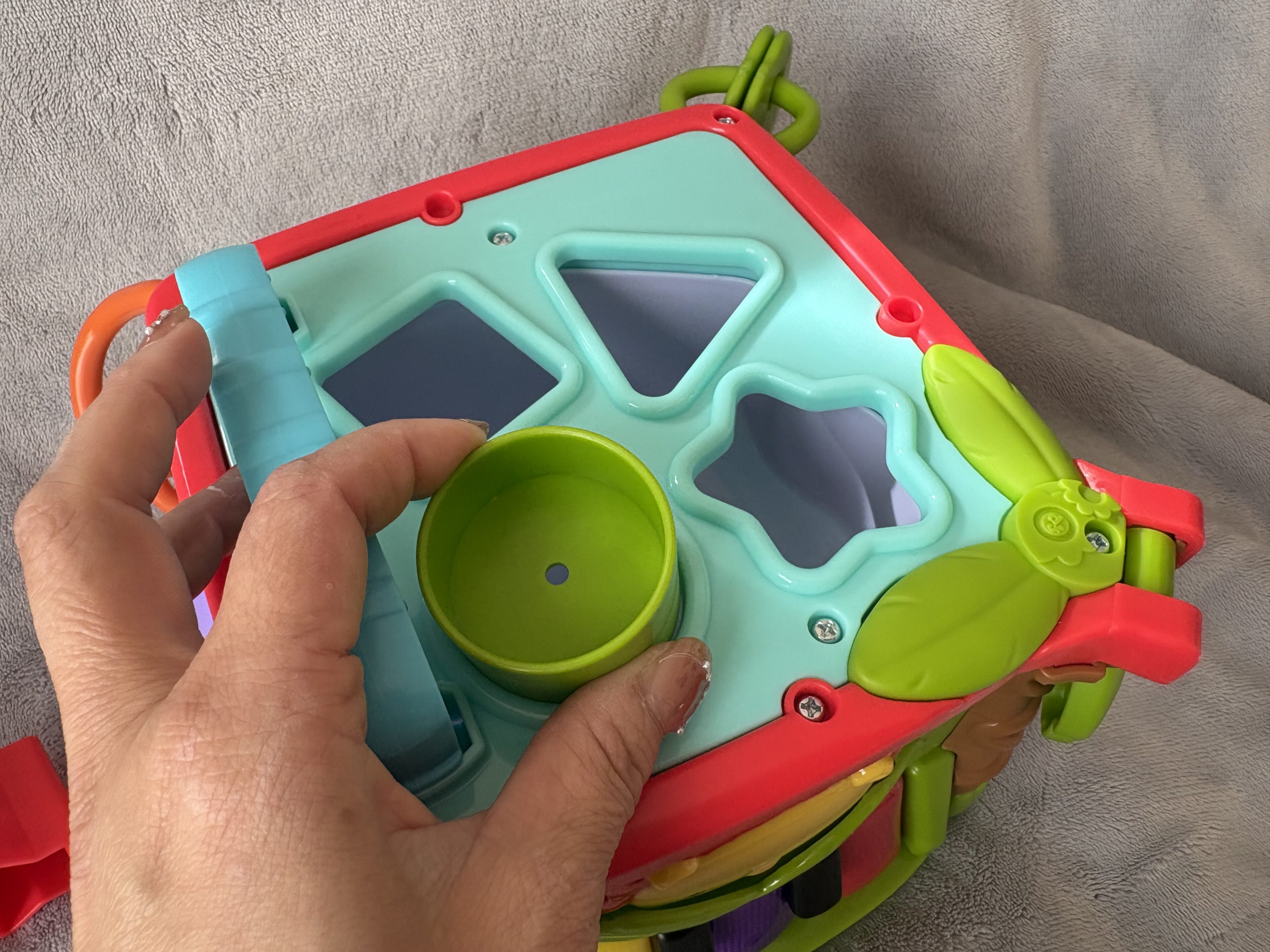 指先を使う遊び、形合わせ、音遊びなどを一つで楽しめる知育玩具。ハーバード大学も推奨する「ダンプアンドフィル(入れて・出す)」遊びを通じて、集中力や手先の発達を促します。