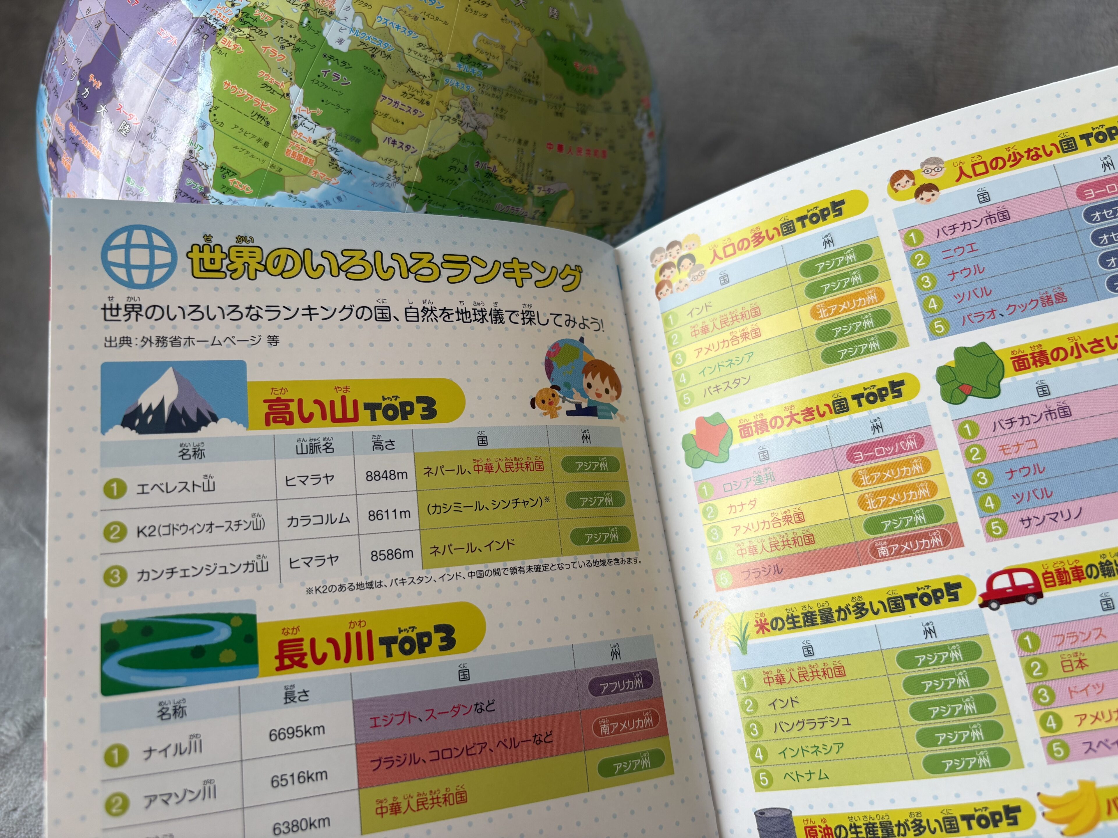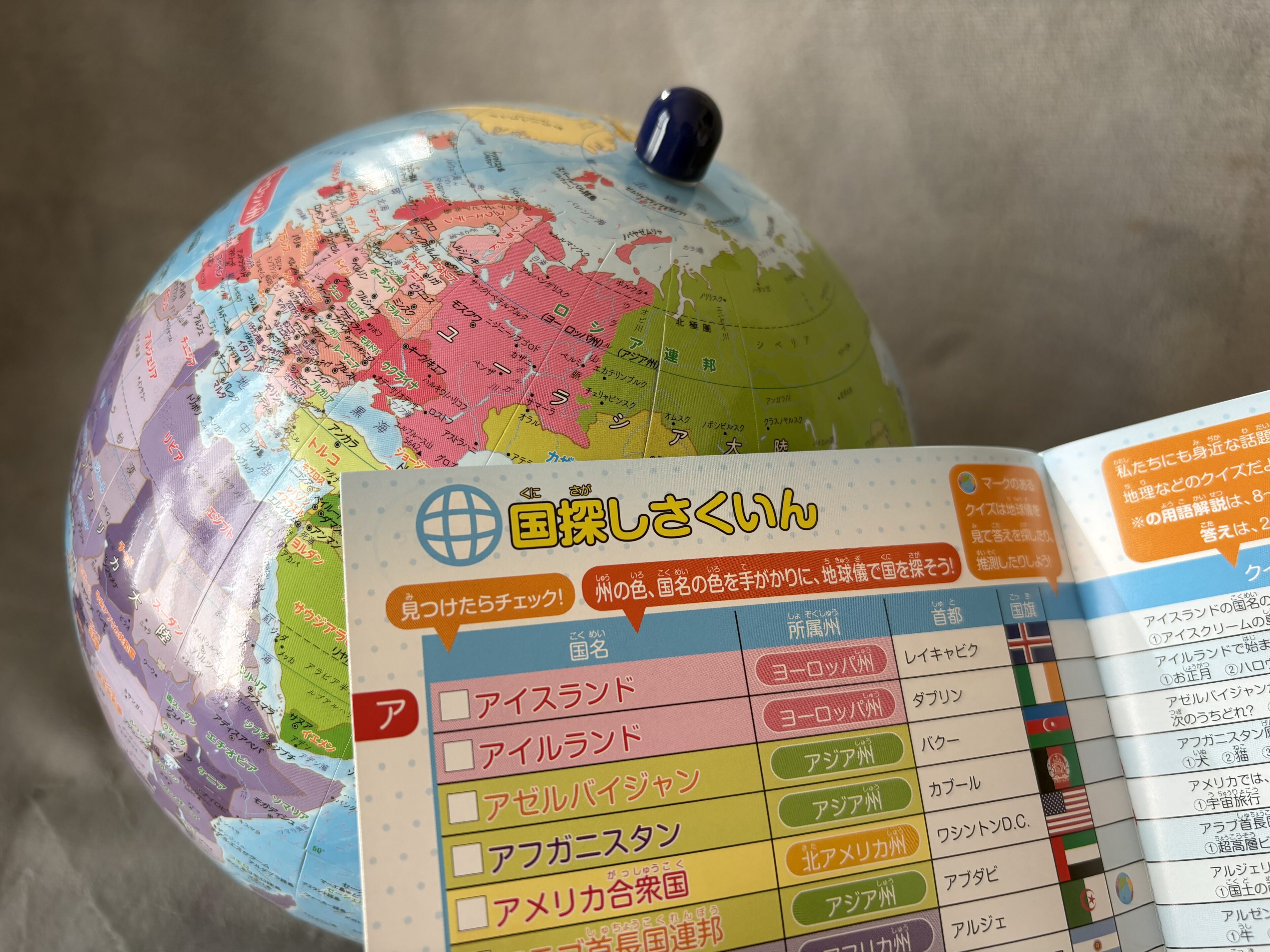50音順索引と色分け地図で子どもでもすぐに国が見つけられる地球儀。地球儀って買ったはいいものの飾ってあるだけ…というご家庭も多いのではないでしょうか。せっかくなら家族の時間に遊んでみませんか。