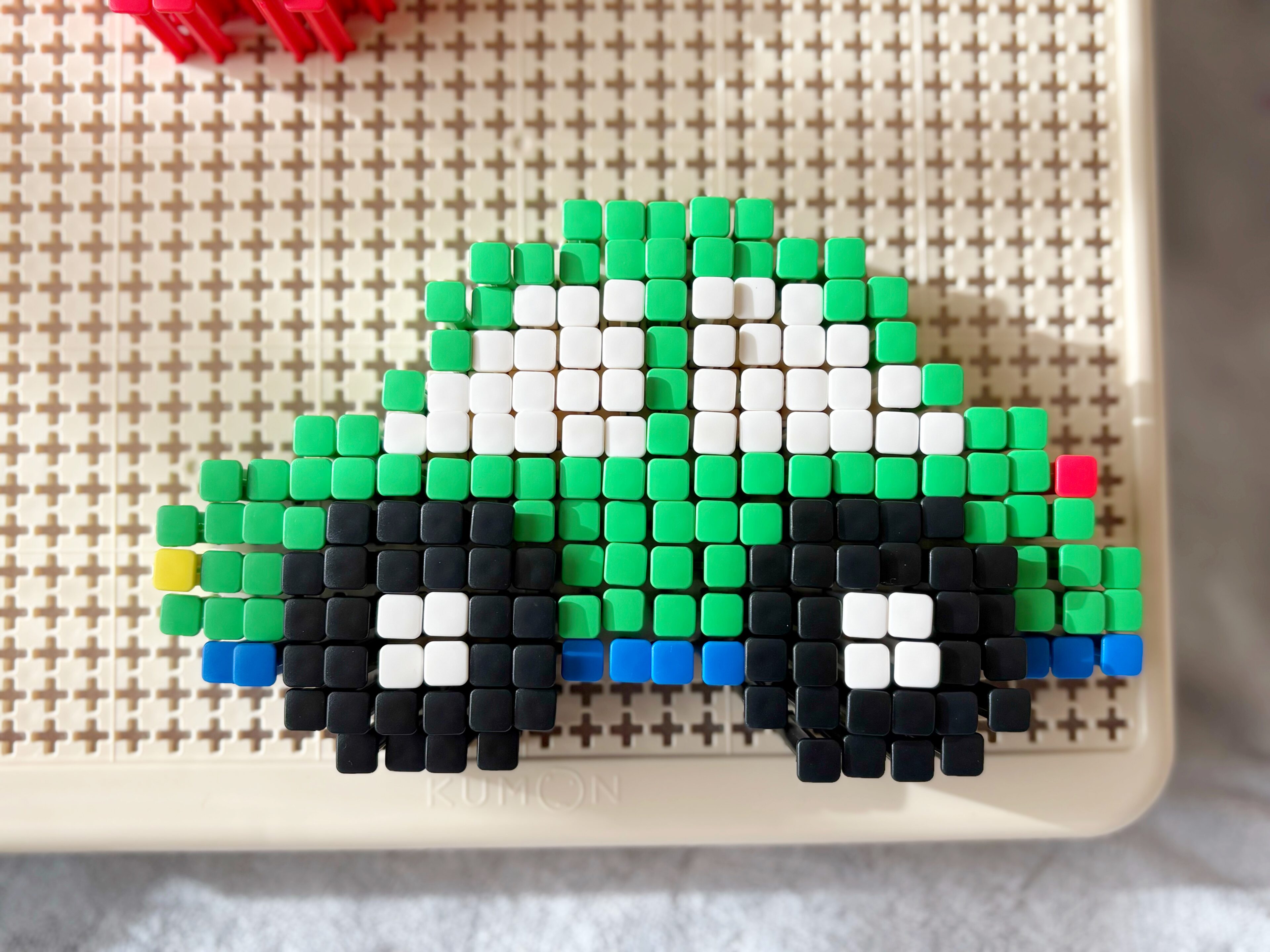挿すだけの単純動作ではあるのですが、ついつい大人でも夢中になってしまうおもちゃは、子どもといっしょに集中して遊べました。慣れてきたら、スティックを浅く挿して、立体的な作品を作っているとさらに面白い!