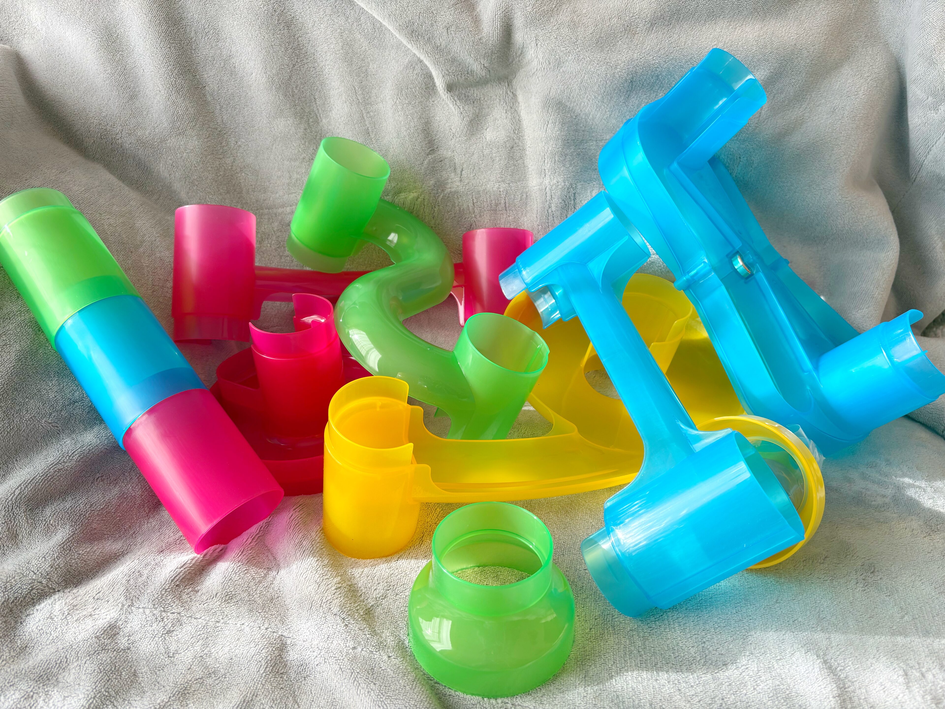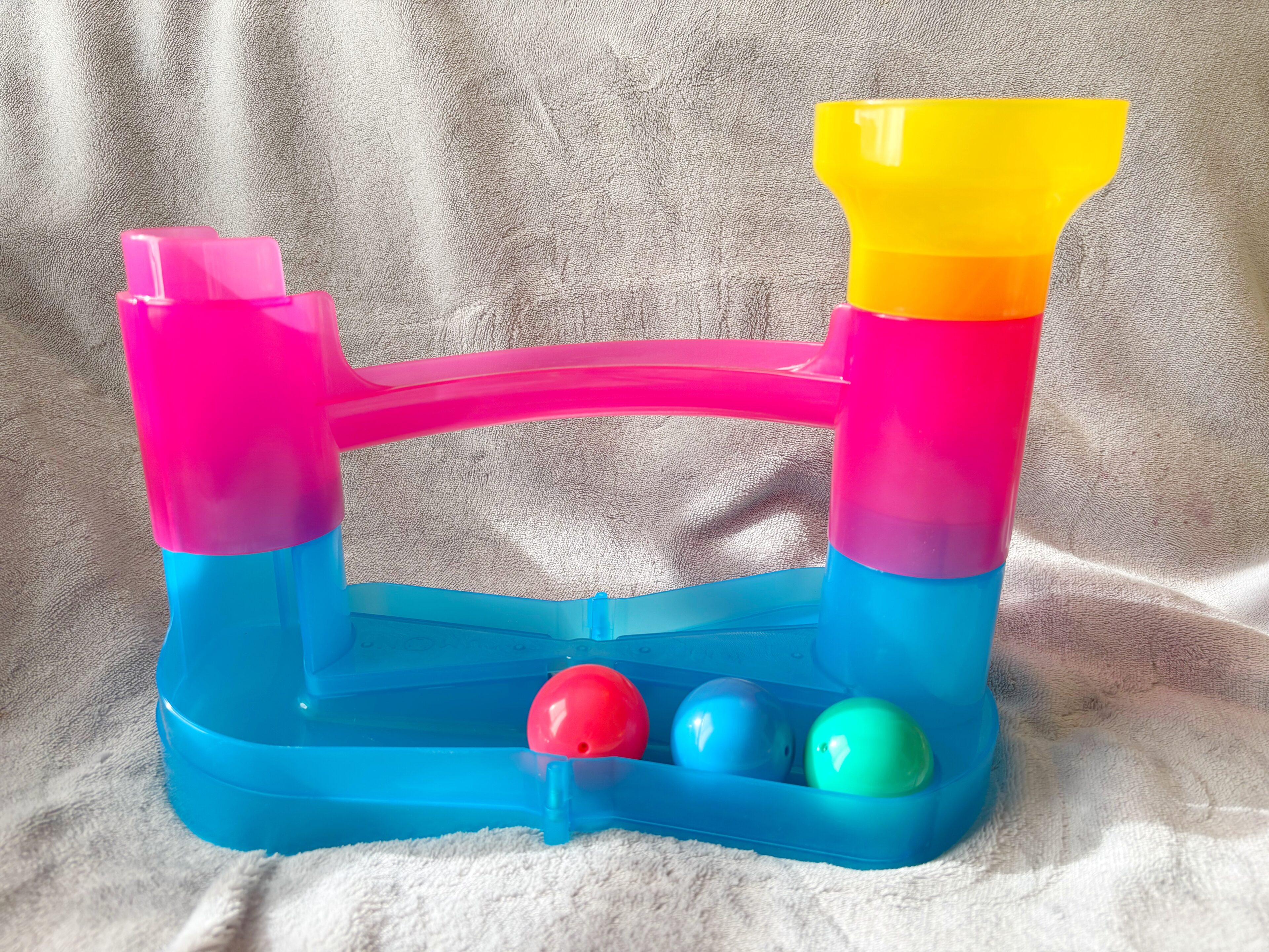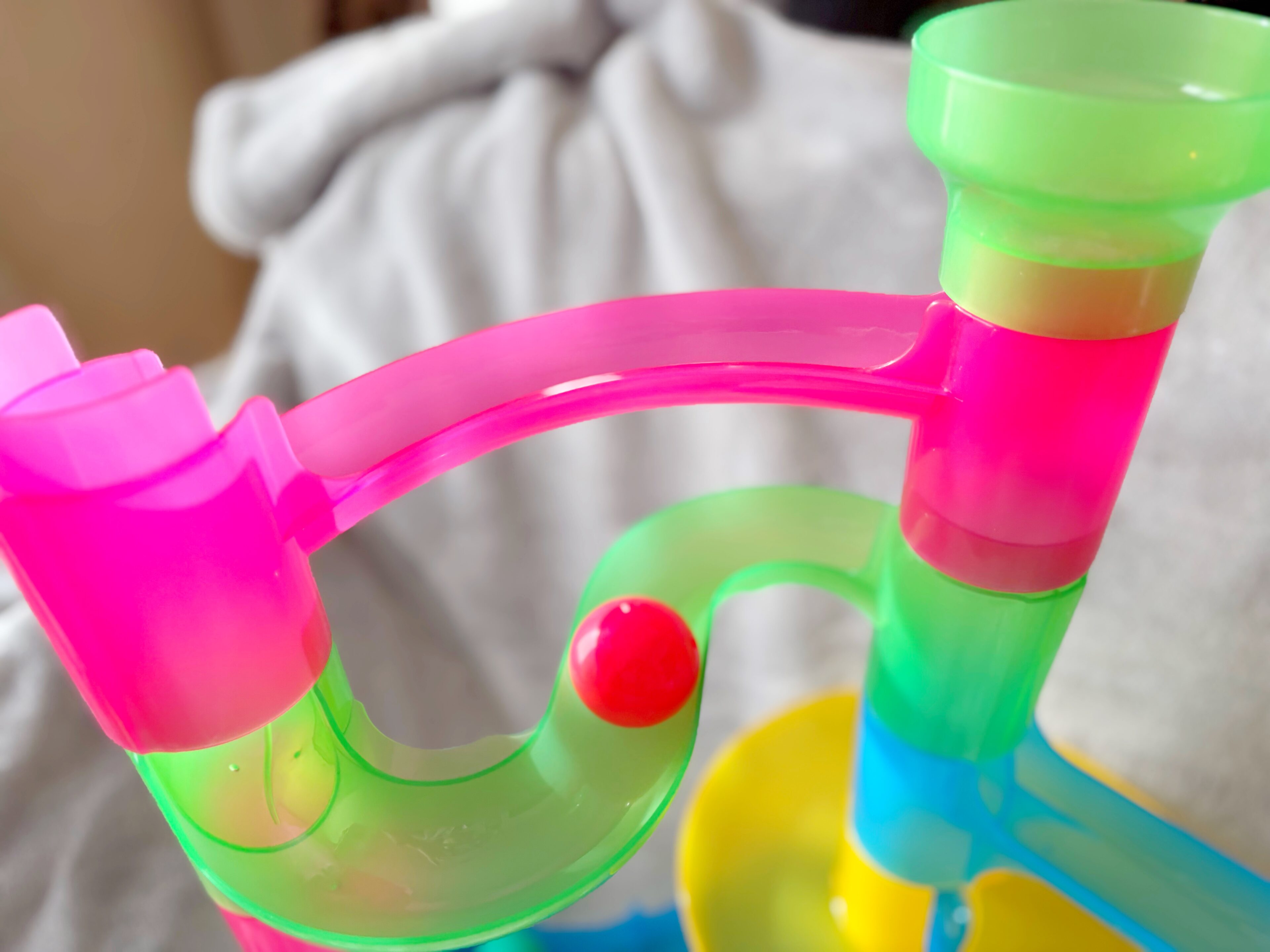 2歳の子どもでも自分でコースを作って、ボール転がし遊びが楽しめる玩具です。作ったコースがゴールまで繋がり、ボールを転がして楽しく遊ぶことで、達成感や創造の意欲に繋がります。
