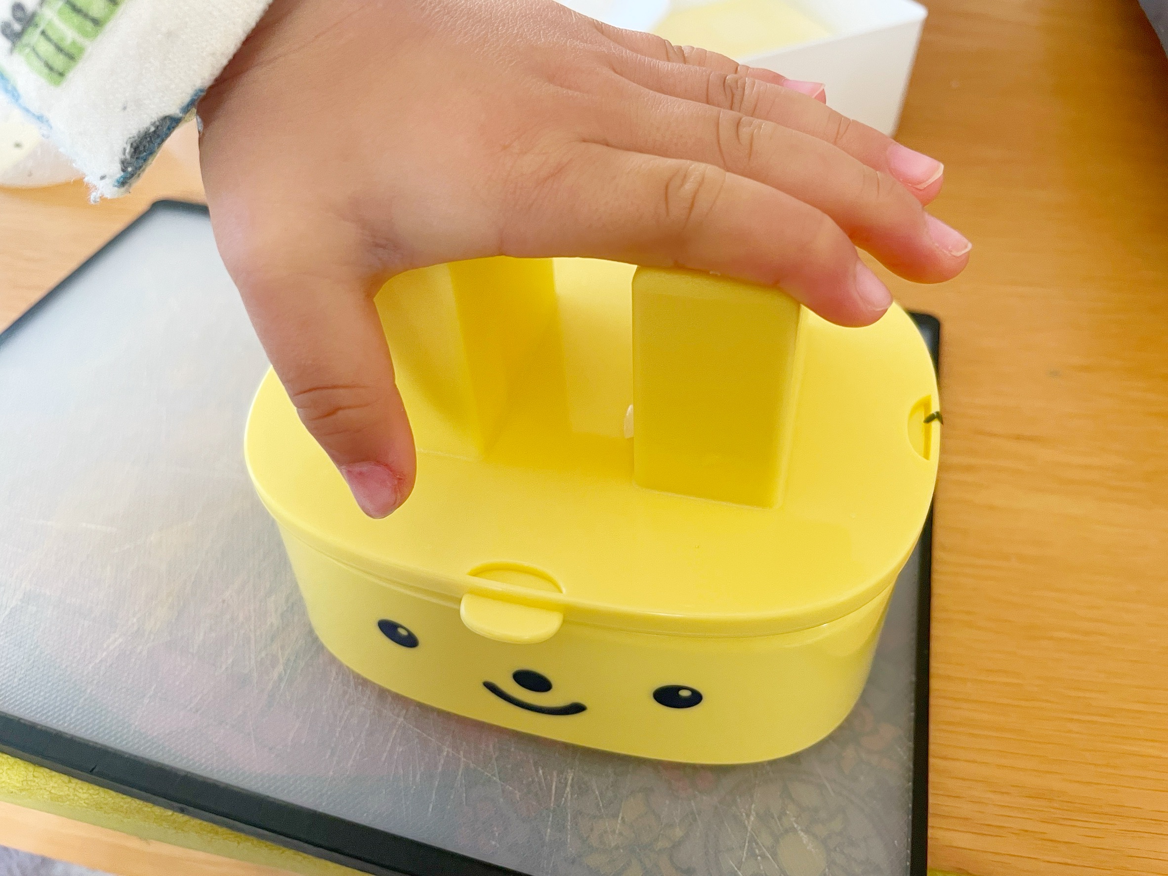 枠を押し下げると、おにぎりが“ぴょん”と飛び出す楽しい仕組みの「とびだすおにぎり型」では、遊び感覚で、はじめてのおにぎり作りがスムーズにできます。かわいいしゃもじ付き。