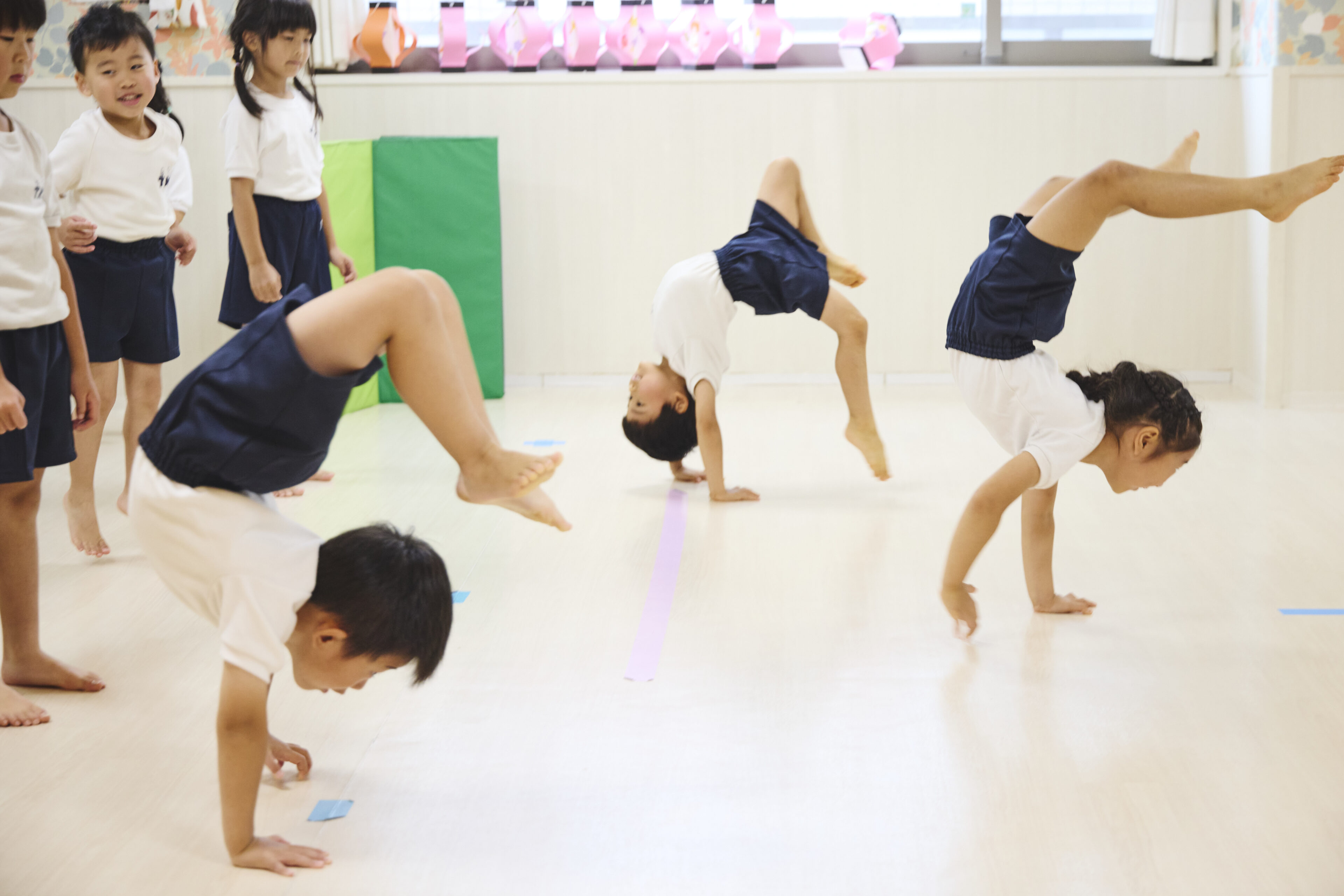 年長さんがやっている逆立ち歩きを見て、年中さん、年少さんは「かっこいい」と言ってマネをします。私たちは、出来ても出来ていなくても、やってみようとする姿勢を見つけたら褒めます。そうすると、いつの間にかできるようになるんです。何よりも大事なのは、子どもたちが「楽しい!またやりたい!」と思えることですね。