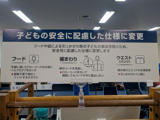 会場では、フードや裾、ウエスト部分のひもなど、子どもの引っかかり事故を防ぐための安全配慮仕様についても紹介されていました。通園・通学や外遊びなど、日常使いを想定した細かな工夫が施されています。