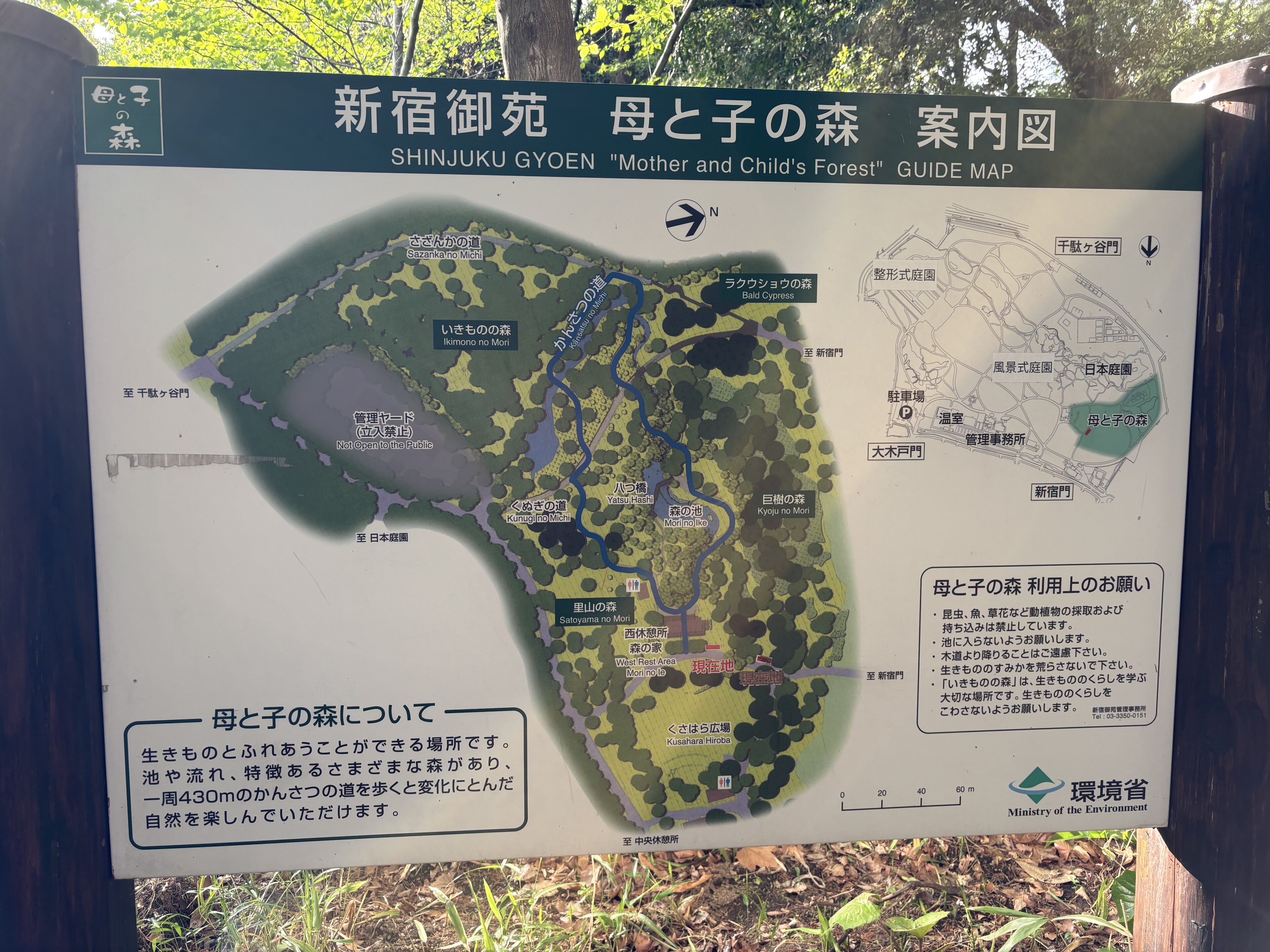 新宿御苑の北エリアに位置する「母と子の森」は、日本の里山に見られる森林、草原、水辺の動植物生息地を再現するべく設計された場所です。430mの遊歩道には木や野の花だけでなく、トンボや蝶などの昆虫、どんぐりや木のみを食べにくる鳥の声も楽しめます。