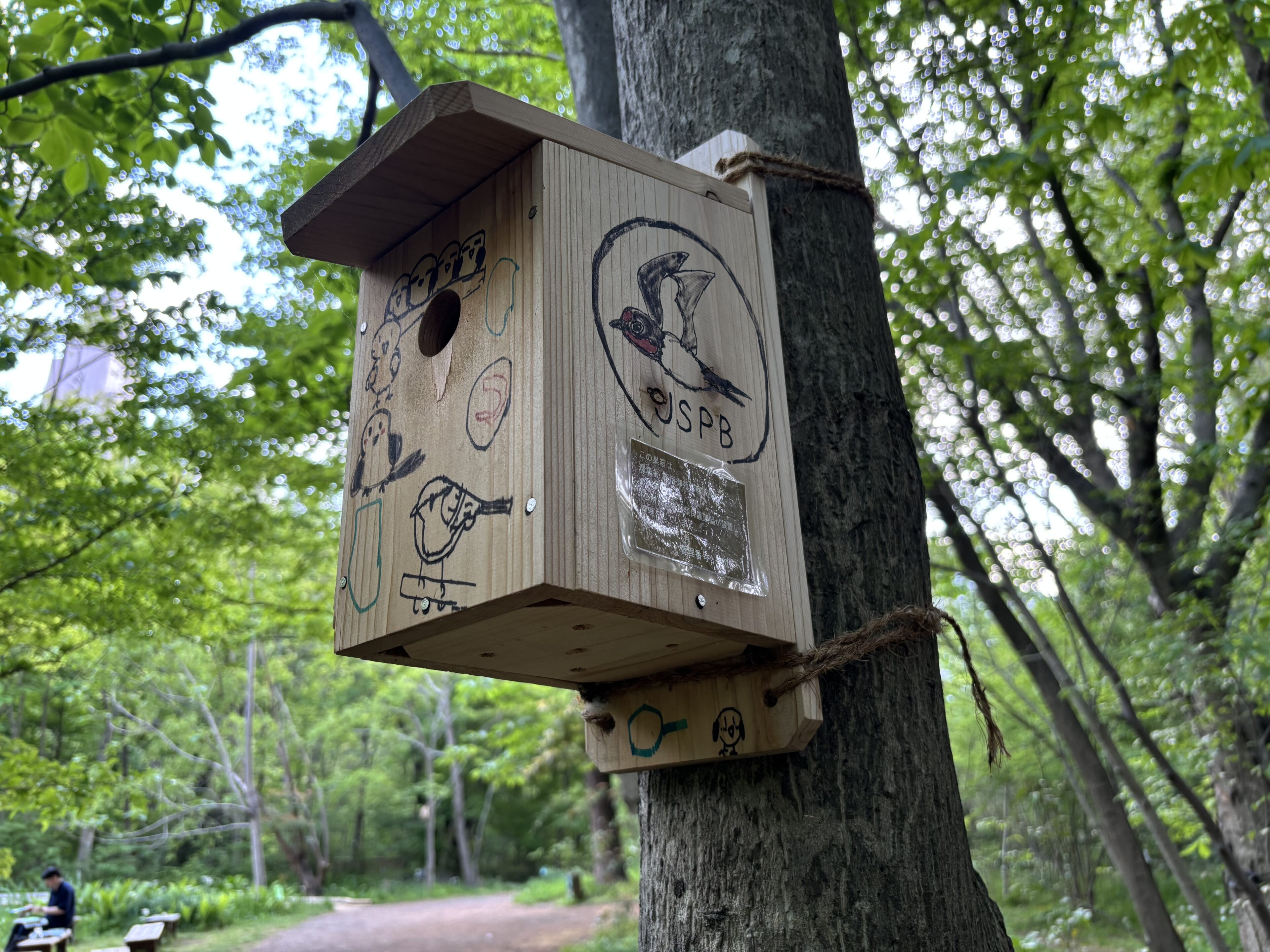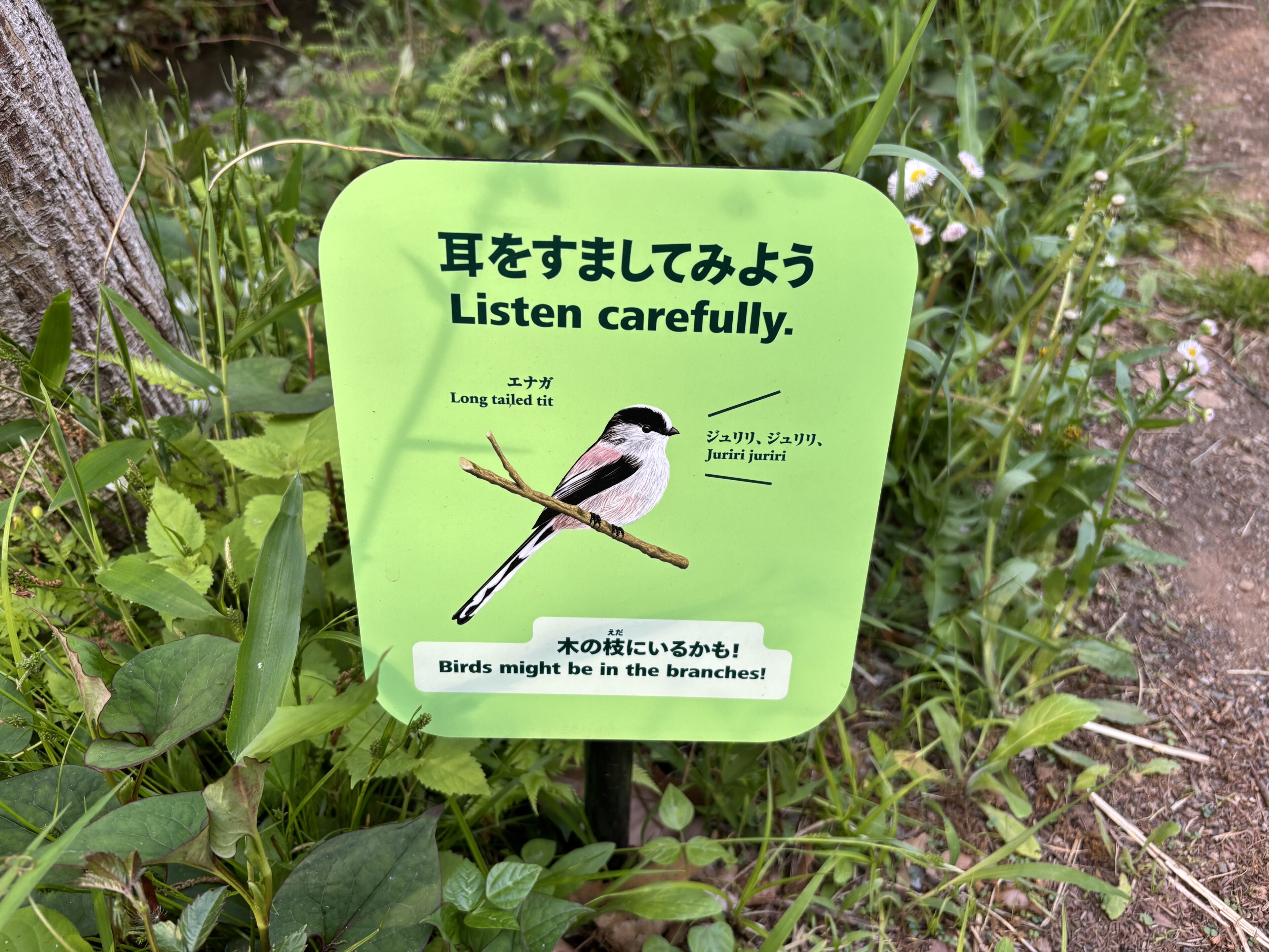 森のそこかしこに、観察ポイントを知らせるサインが置かれています。この看板を見て、早速耳を澄ませてみると、チッチ、チッチと短く鳴く声が聞こえていました。