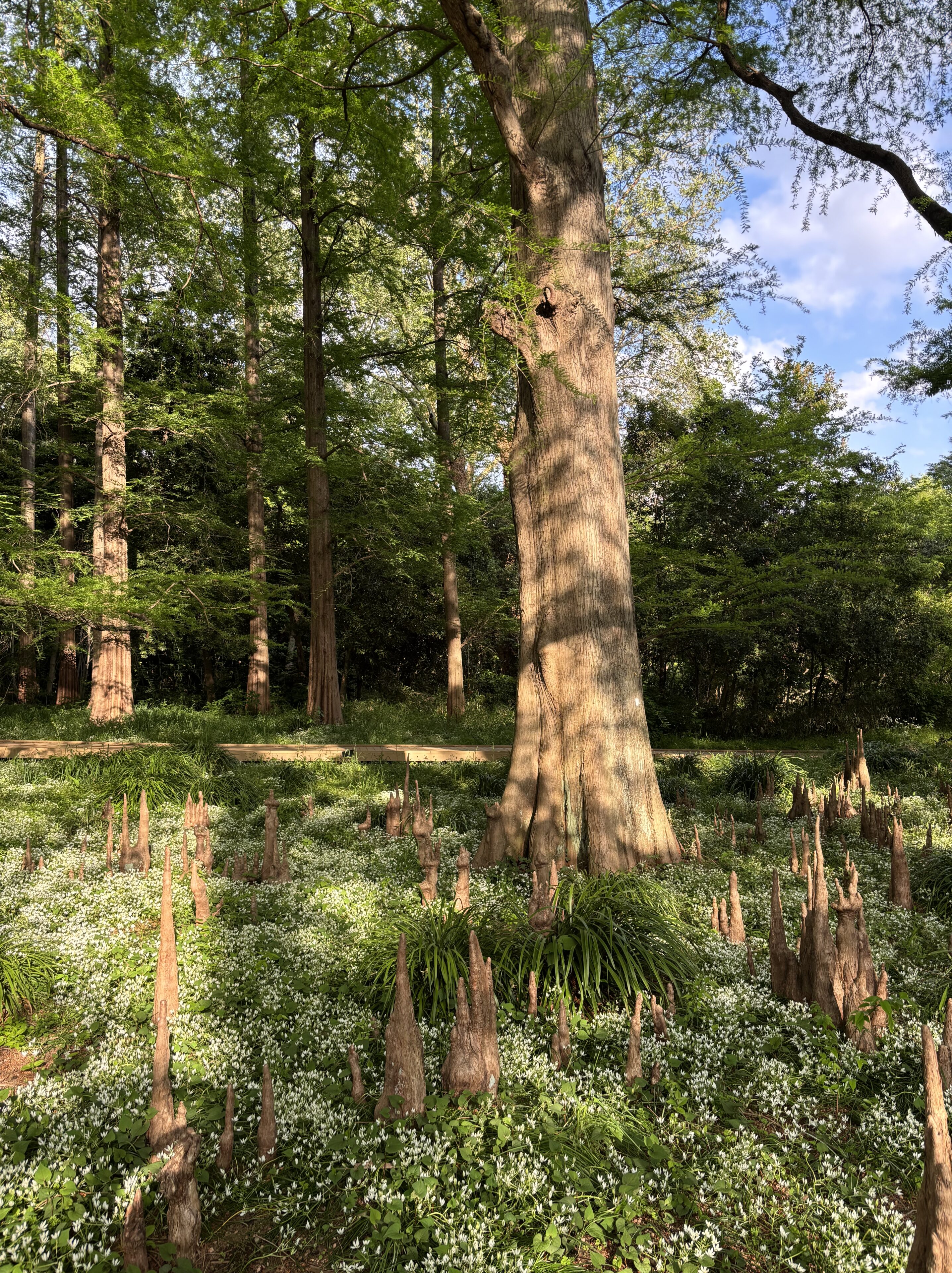 中でも、私がぜひ見てほしい!と思うポイントは「ラクウショウの森」です。秋になると枝が鳥の羽のように落葉することから「落羽松」と呼ばれるそうですが、ここに生えているのは明治時代に植えられた樹齢100年を越える巨木です。