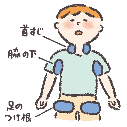 顔が赤い、大量に汗をかくなど、普段と違う様子があれば、すぐに涼しい場所で休憩しましょう。服を緩め、両側の首すじ、脇の下、足の付け根などを冷やして。また、細かい血管が通る手のひらを冷やすのもおすすめです。自分の力で水分補給をすることもできない様子であれば、すぐに救急車を呼びましょう。