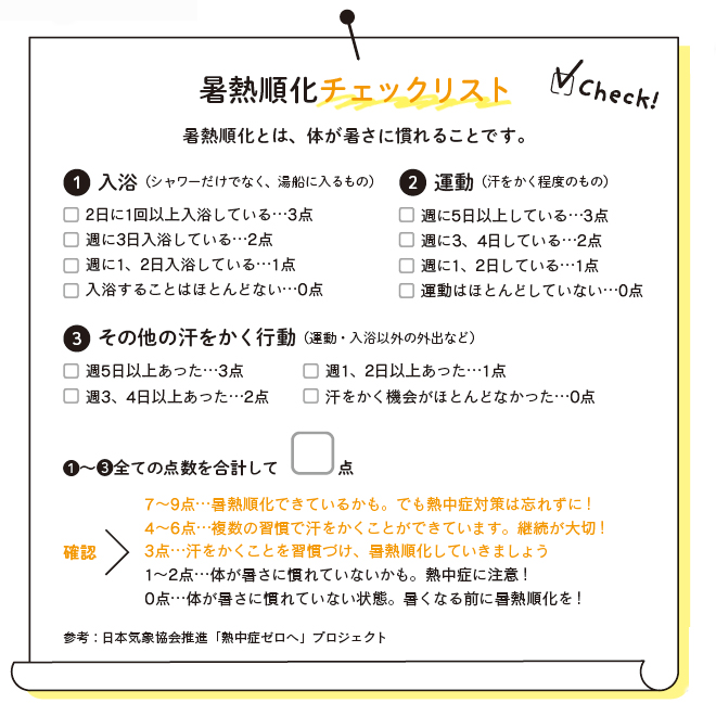 5月は、体がまだ暑さに慣れていない時季にも関わらず、夏日(最高気温25℃以上)や真夏日(最高気温30℃以上)になることもあるため、特に注意が必要です。今から体を暑さに慣らす「暑熱順化」をすることで対策しましょう。暑熱順化ができている体は、熱放射がしやすい、汗に含まれる塩分が少なくナトリウムを失いにくい、といった、熱中症になりにくい状態になります。下記リストを参照に、暑くなる前から運動や入浴などで汗をかき、体を暑さに慣れさせましょう。