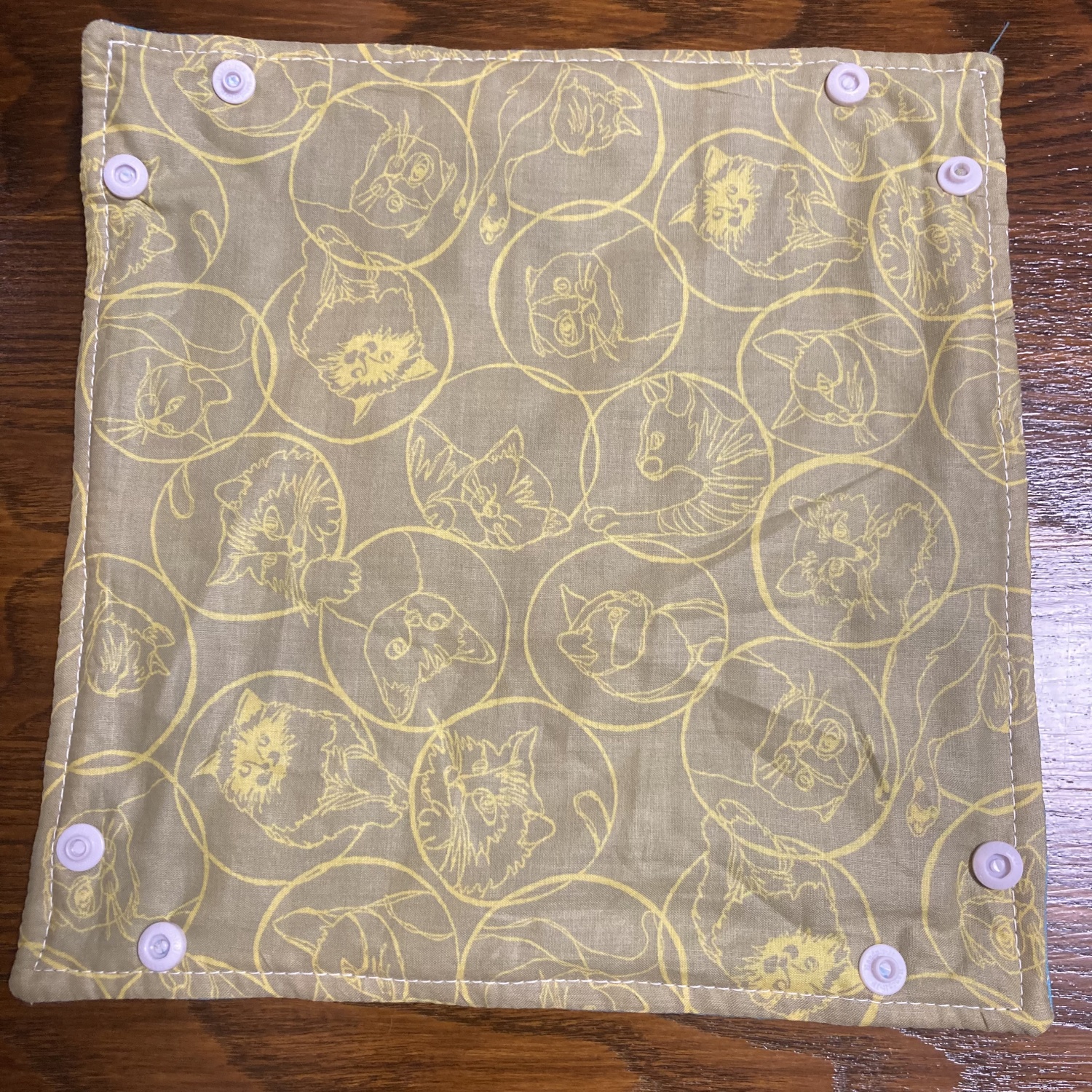 四隅を画像の様に三角に合わせ、角から3cm程度、生地端から1cm程度の場所に千枚通しなどでボタンを通すための穴をあける。