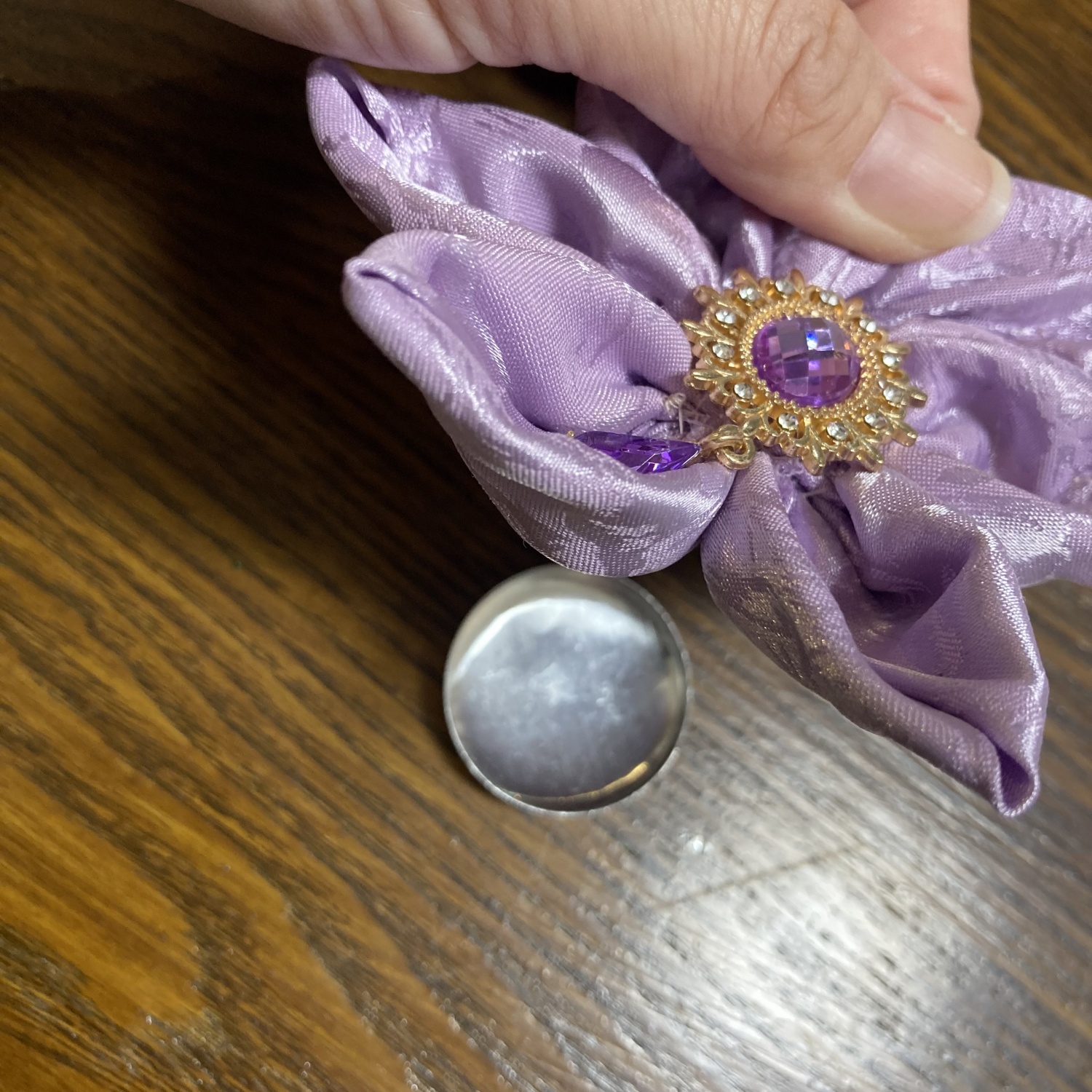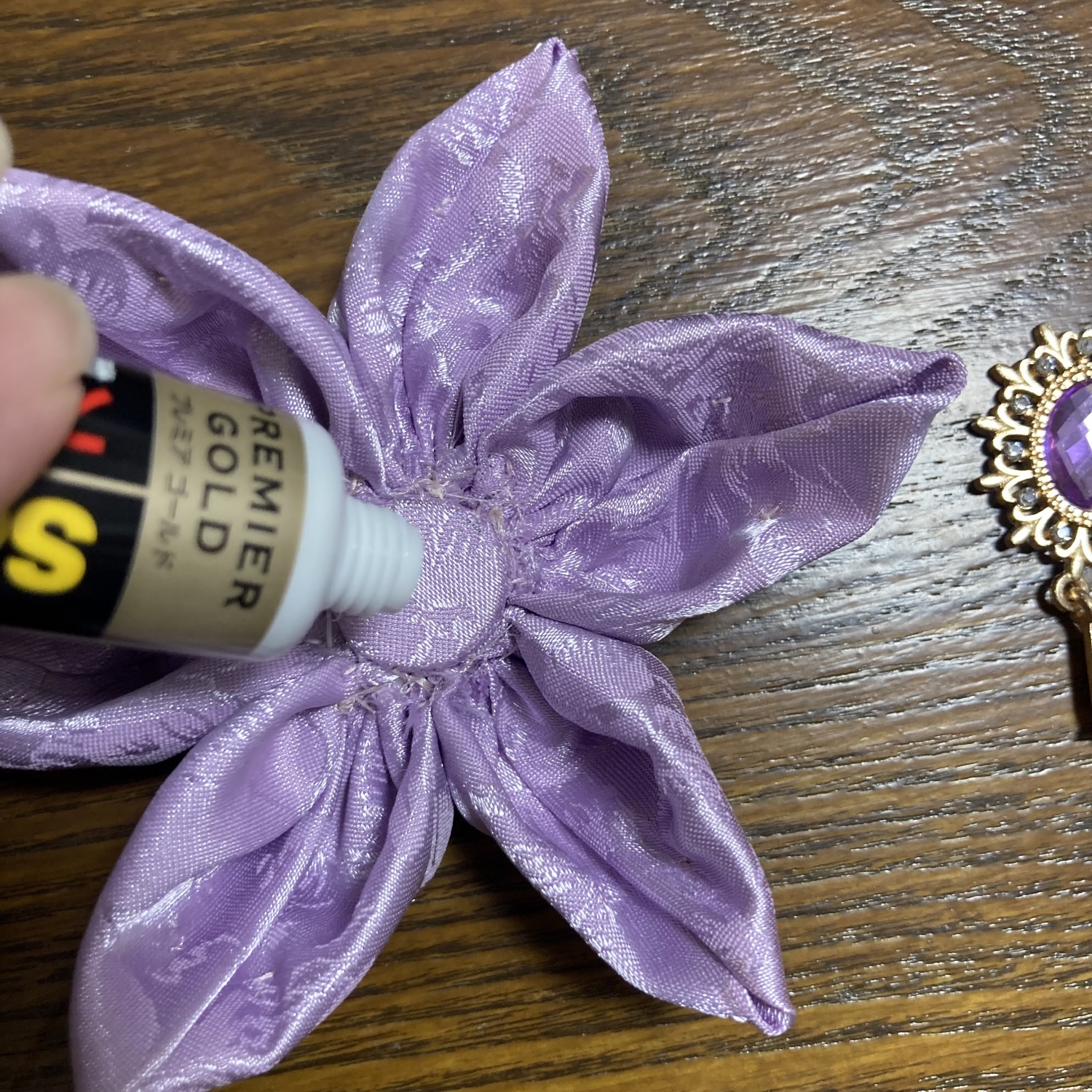 ファブリックフラワーのサイズに合わせたくるみボタンパーツに、画像の様に接着剤で取り付け、土台にして貼り付けをします