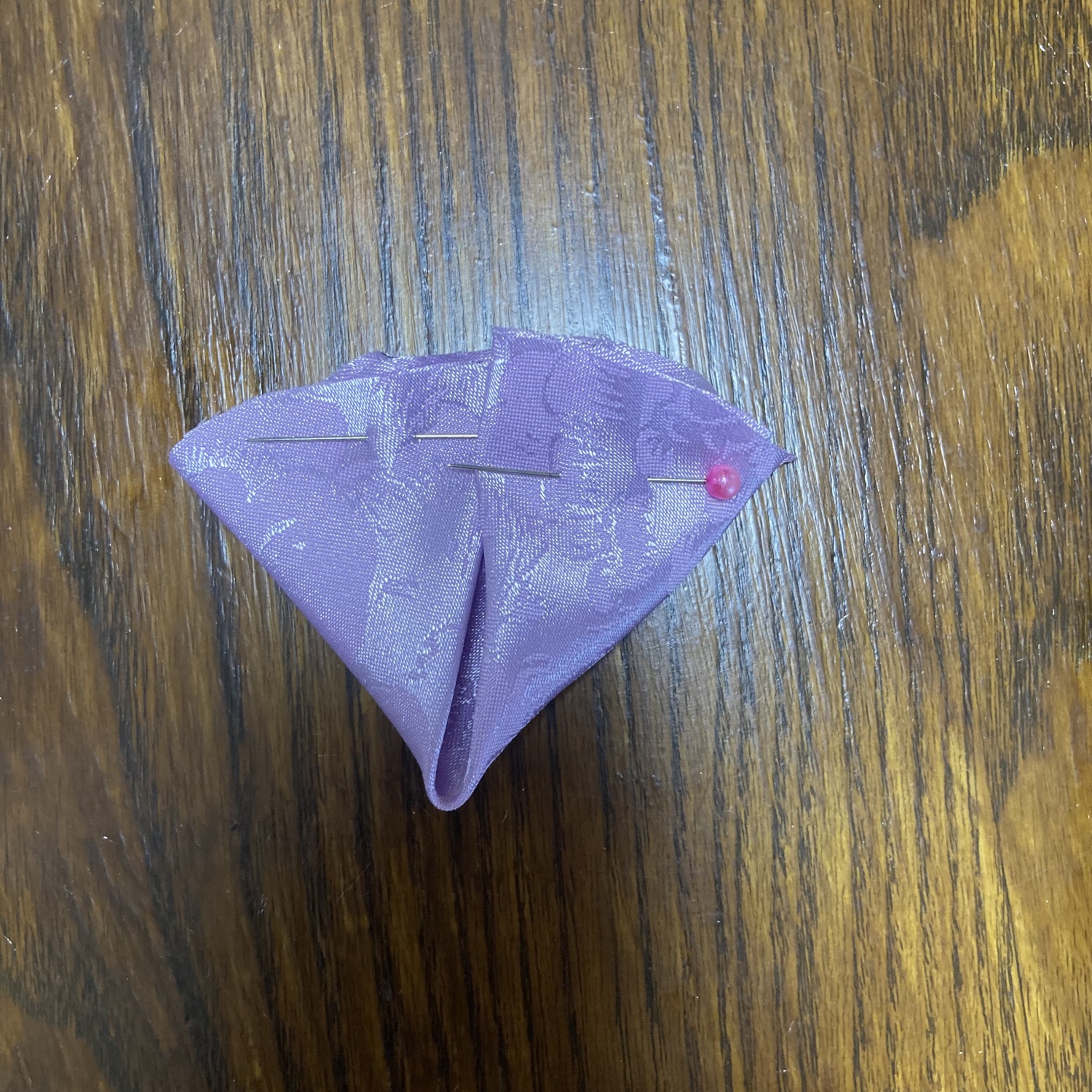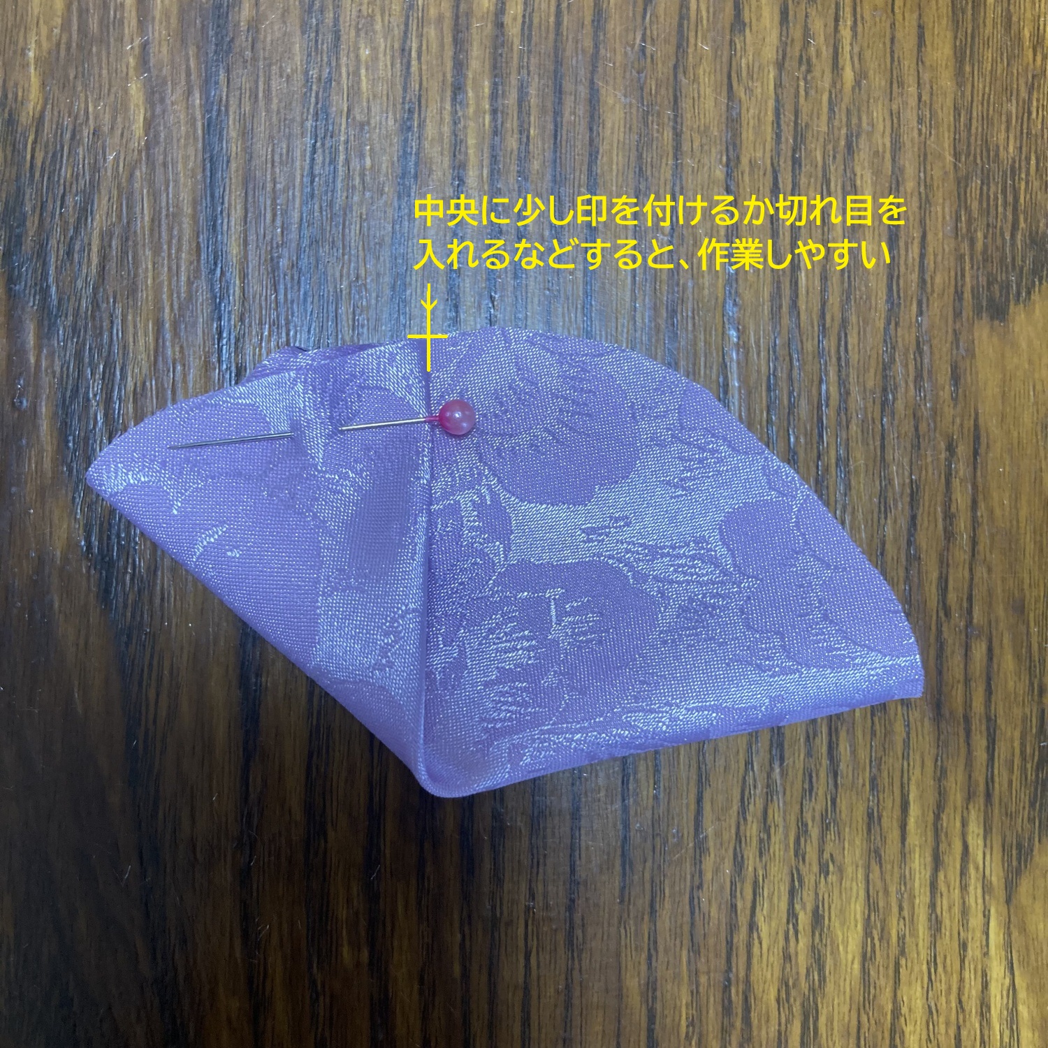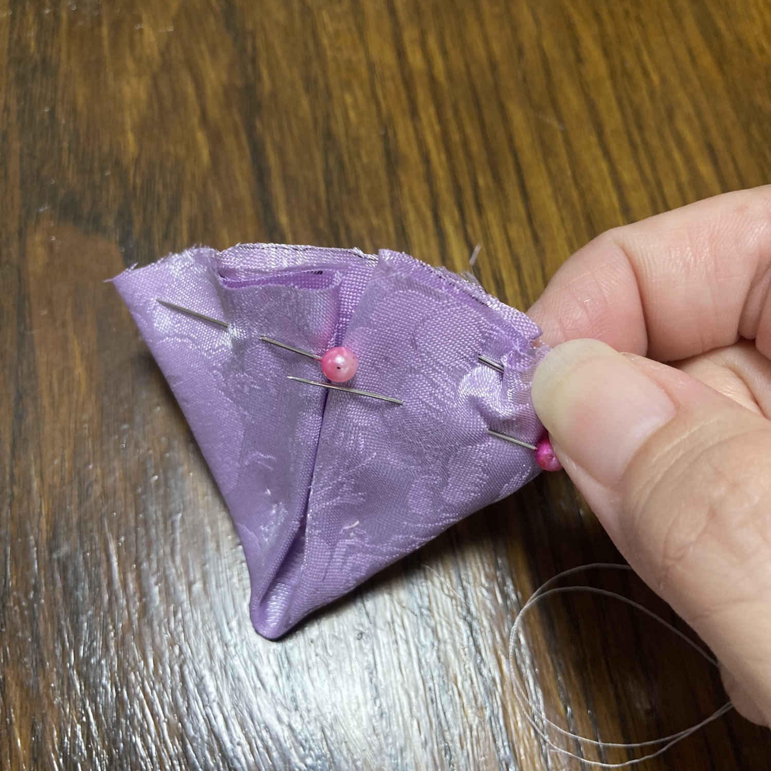 花びら用生地を半分に折り、それを画像の様に更に半分の位置に向かって折り目の端を合わせるように折りたたみ、広がらないようにまち針で留めるか、アイロンで形を押さえる