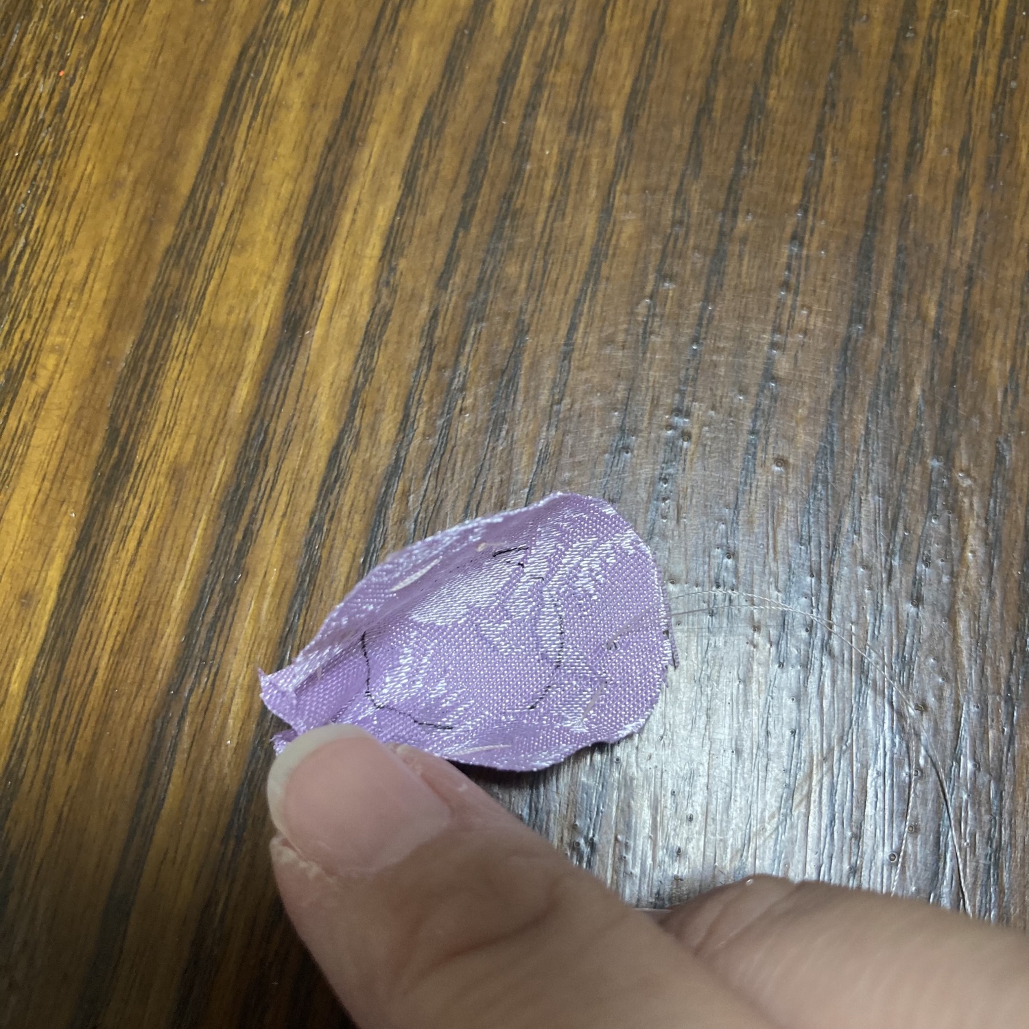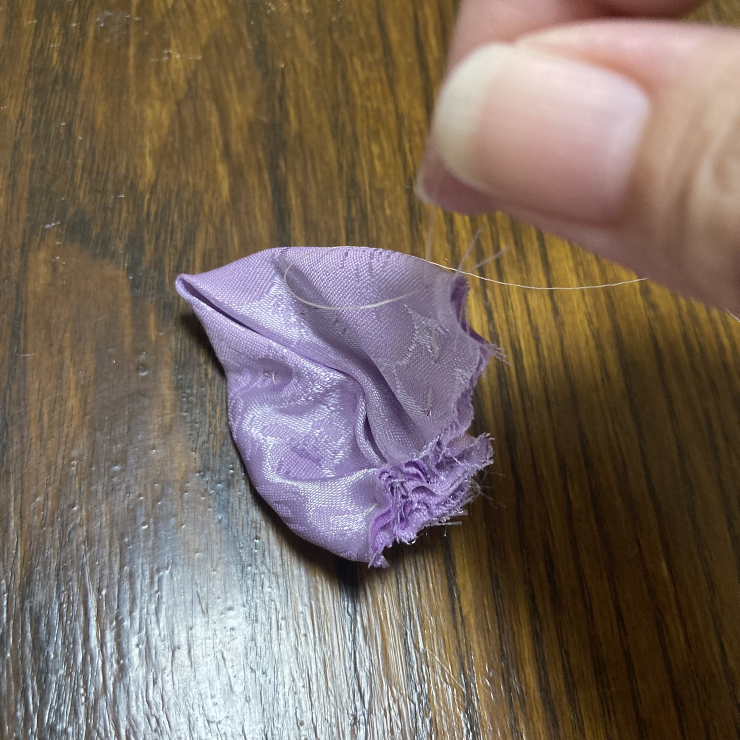 折りたたんだ花びら用生地の、カーブを描いている側の端から3mm程度の所をぐし縫いし、糸を引いて画像の様にぎゅっとギャザーを寄せ、縫い留める