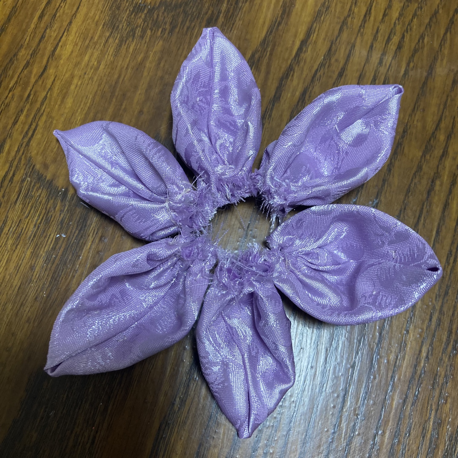 作成した花びらの絞った部分を6枚、繋げるように糸を通して丸く縫いまとめ、花の形にする
