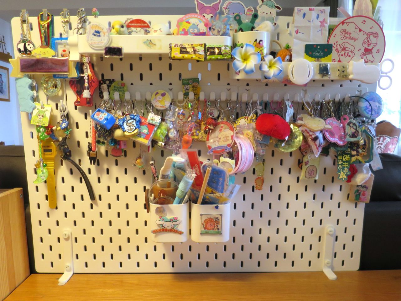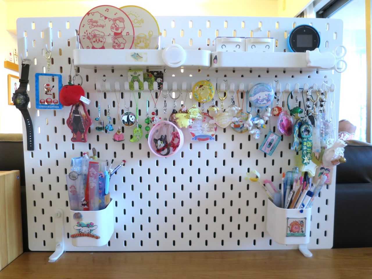 これまでは、学習机の前に取り付けた IKEA の有孔ボード収納スコーディスに、フックやシェルフを使って飾っていましたが、気づけば“全部飾る”状態に。下のほうに掛けたものは見えにくく、耐荷重も心配になるほどでした。また、机の目の前がごちゃついていると、集中しにくいのでは…という懸念もありました。