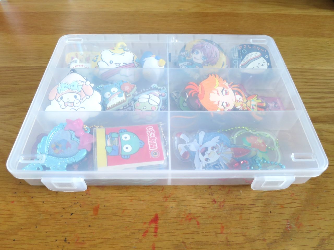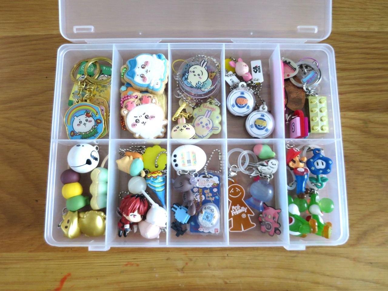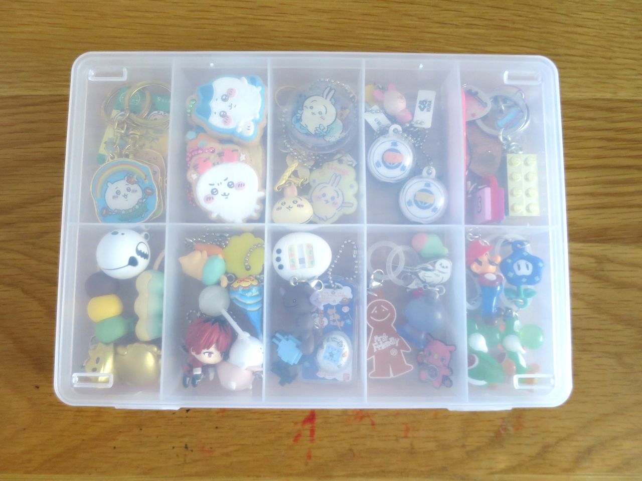 収納に使ったのは、100円ショップで購入できる SIKIRI シリーズ。細かいアイテムをまとめるのに便利で、今回の用途にもぴったりです。仕切りの数や深さの違うタイプがいくつかありますが、めじるしアクセサリーや小さめのキーホルダーには SIKIRI 10 を使いました。小さいものなら1つのマスに数個入るので、種類やキャラクターごとに分けて整理することもできます。