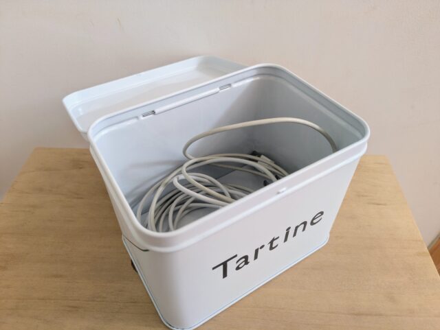 絡まりやすいスマホの充電コードやイヤホンは、見た目もごちゃつきやすいもの。中サイズの缶に入れておけば、すっきりまとまり、使いたいときにさっと取り出せます。リビング用、寝室用など、使う場所ごとに分けて保管するのもおすすめです。よく使うアイテムは、フタと本体がつながった一体型の缶を選ぶと、開け閉めがスムーズで使いやすくなります。