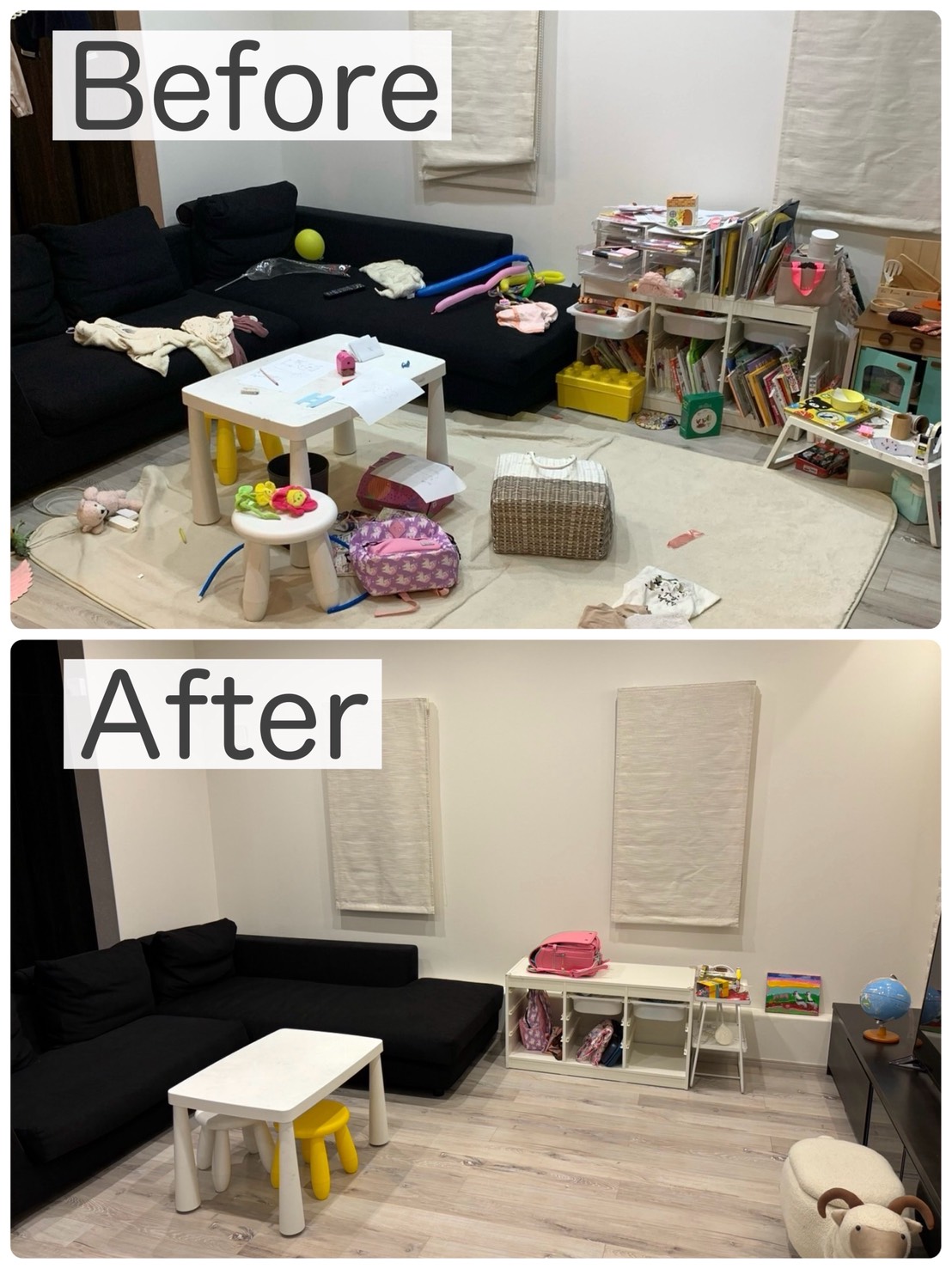 片づけの順番と2つの収納カテゴリーを意識することで、散らかりにくくリビング学習できるスペースも生まれます。少しずつ進めてみてくださいね。