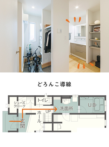 また、外遊びや習い事のあとにすぐ手洗い・着替えができる「どろんこ動線」のように、玄関から洗面・収納へつながるルートを整えると、汚れをリビングに持ち込まず、片づけもスムーズになります。こうした配置や動線の工夫が家の中にあると、“子どもが自分で片づけやすい環境”=親の毎日がラクになる暮らしにつながっていきます。