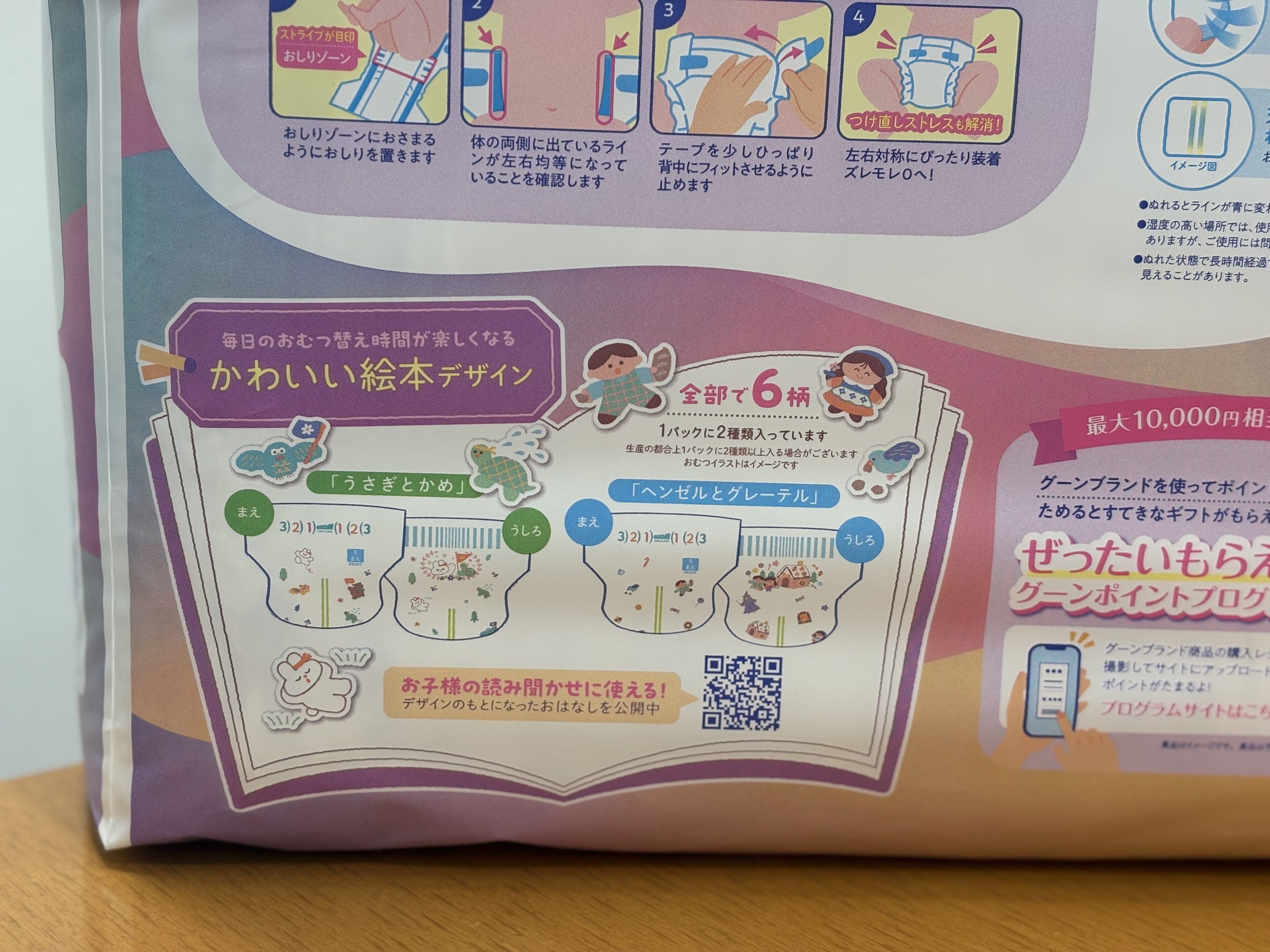 イラストレーター・かわべしおんさんによる、「ブレーメンのおんがくたい」などの絵本をモチーフにした全6種のかわいいデザインをおむつ柄に採用し、親子のコミュニケーションのきっかけも演出してくれます。