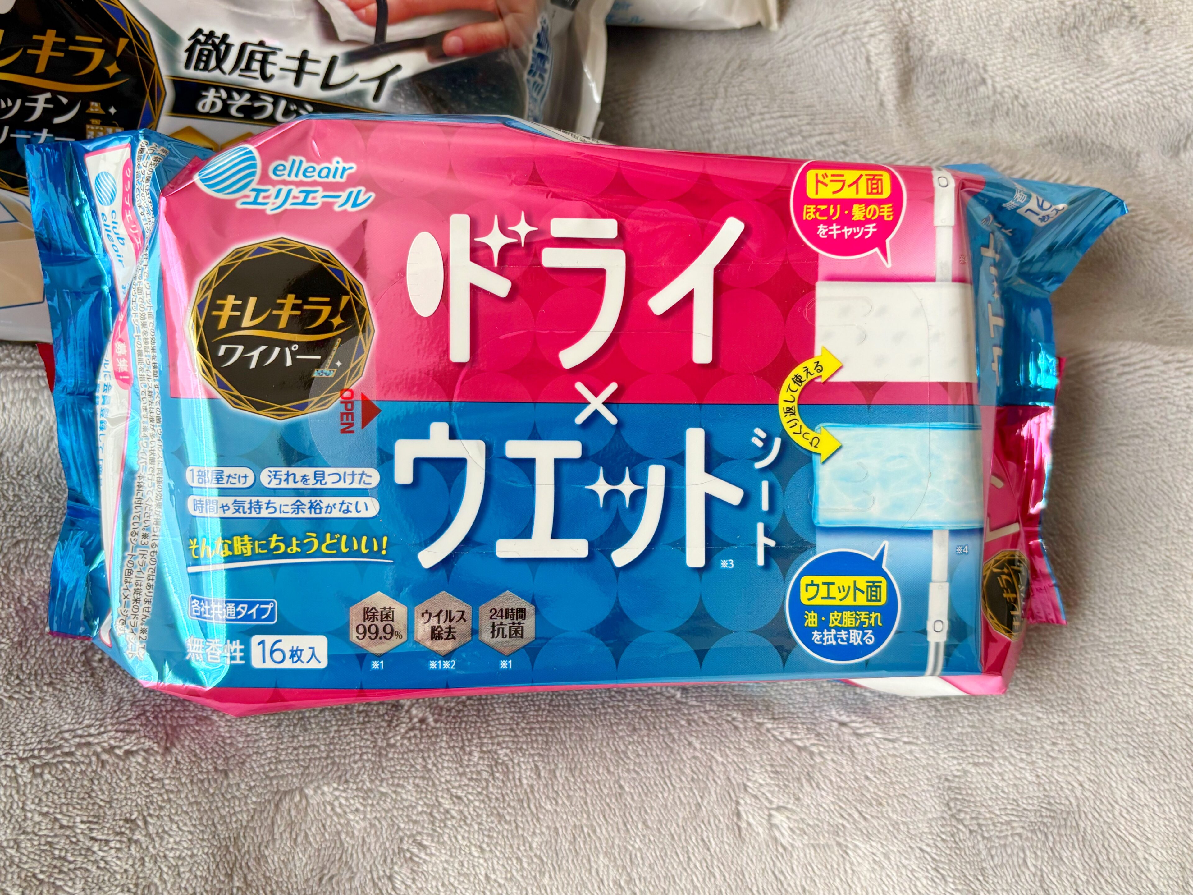 今までは乾拭き用と水拭き用を2種類準備していましたが、これ一つで床掃除を済ませることができるため、収納スペースやごみ削減にも繋がりました。