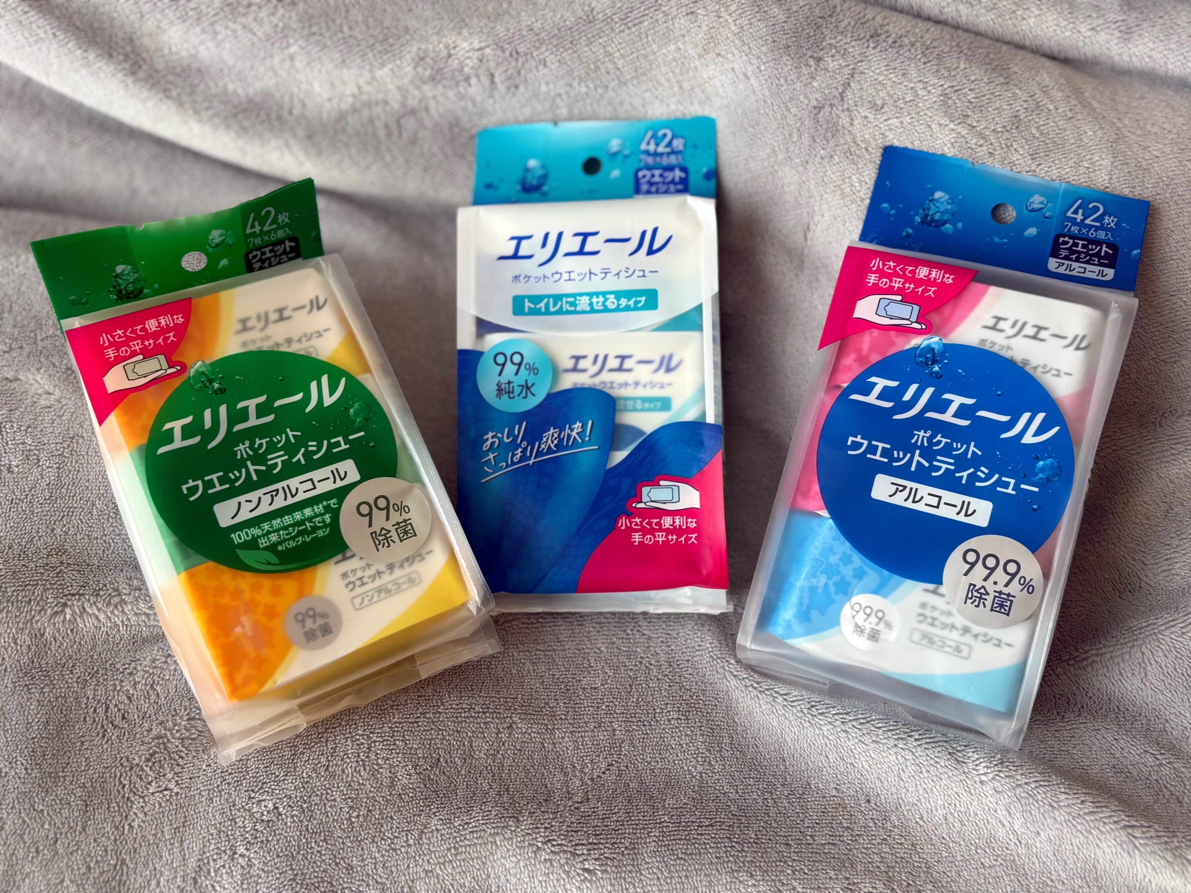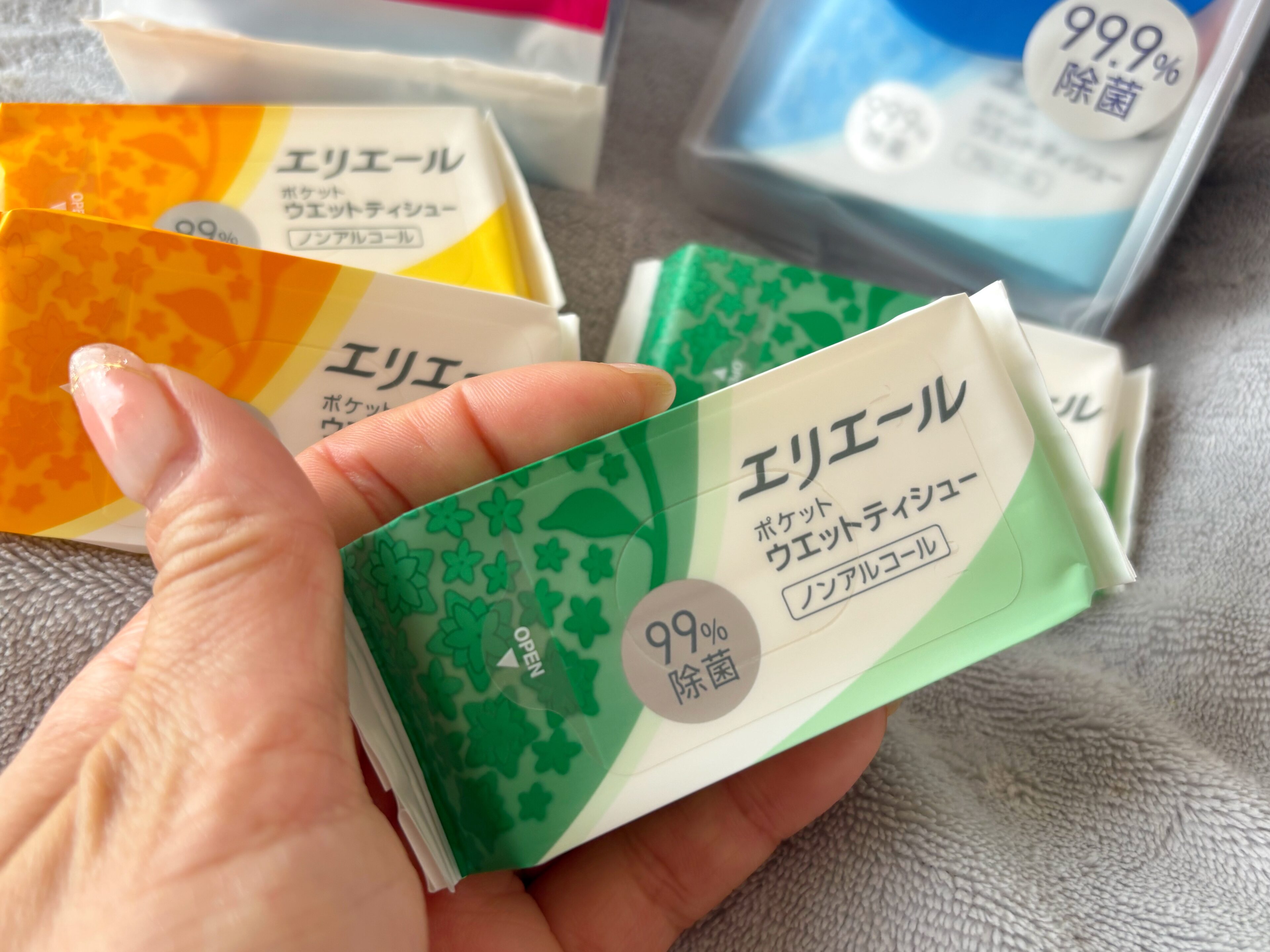 昨年10月に発売され、ママたちの間でも話題になっているのが、手の平サイズのウエットティシュー「エリエール ポケットウエットティシュー」。通常品の約5分の1というコンパクトなサイズ感はかなり重宝するアイテムです!ママのポーチの荷物を減らしてくれるのはもちろん、子どものお弁当に添えたり、旅行のときにも持っていきたい!特に、「トイレに流せるタイプ」は、海外旅行にぴったり。