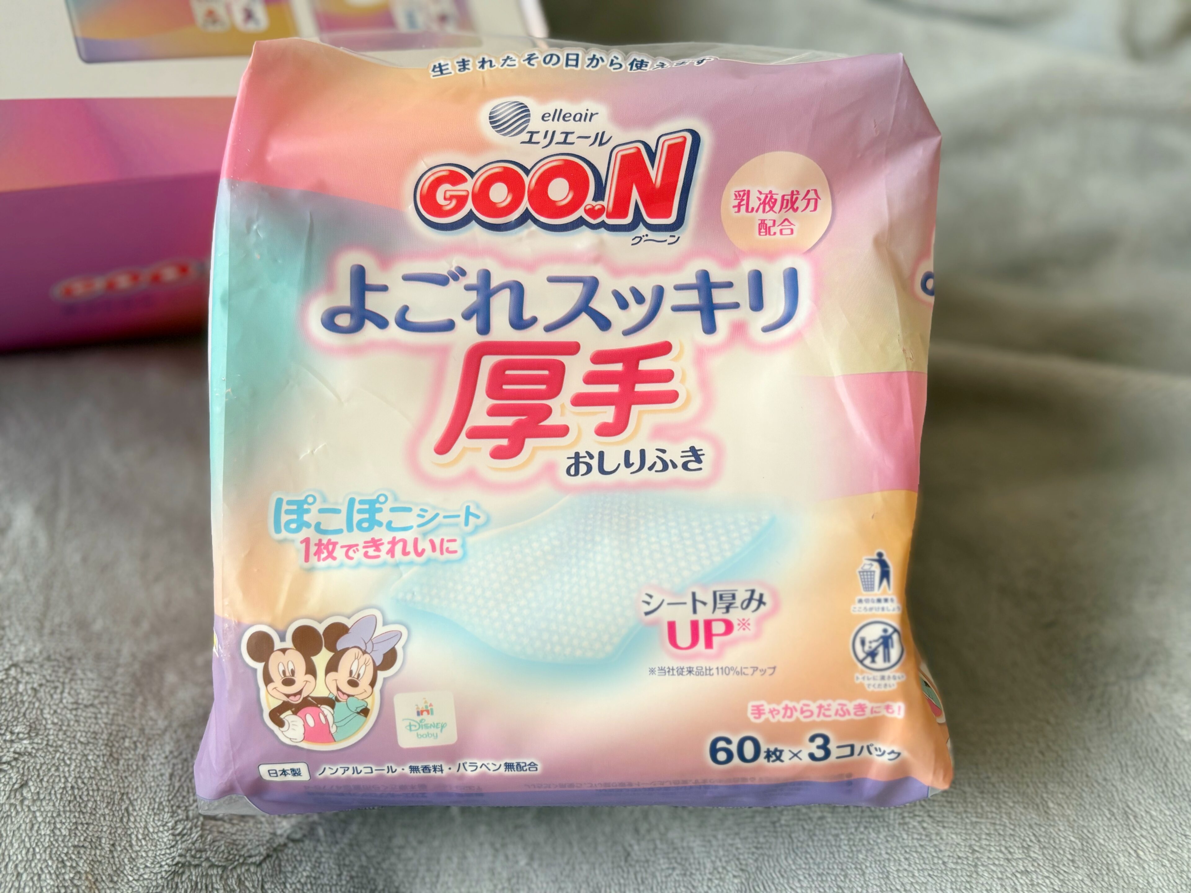 同時に登場したおしりふきも見逃せないポイント。「グーン よごれスッキリ厚手おしりふき」は、シートの厚みが10%アップ(※従来品比)して、手を汚さず、1枚でしっかり拭き取れるので時短に。うんちになじむ乳液成分配合で、うんち汚れもさっと拭き取れます。さらに、シアバターベール(肌の保護)がデリケートなお肌をやさしく守ってくれるのも安心ポイント!おむつ替えの「何枚も使う問題」を解決して、コスパも◎。