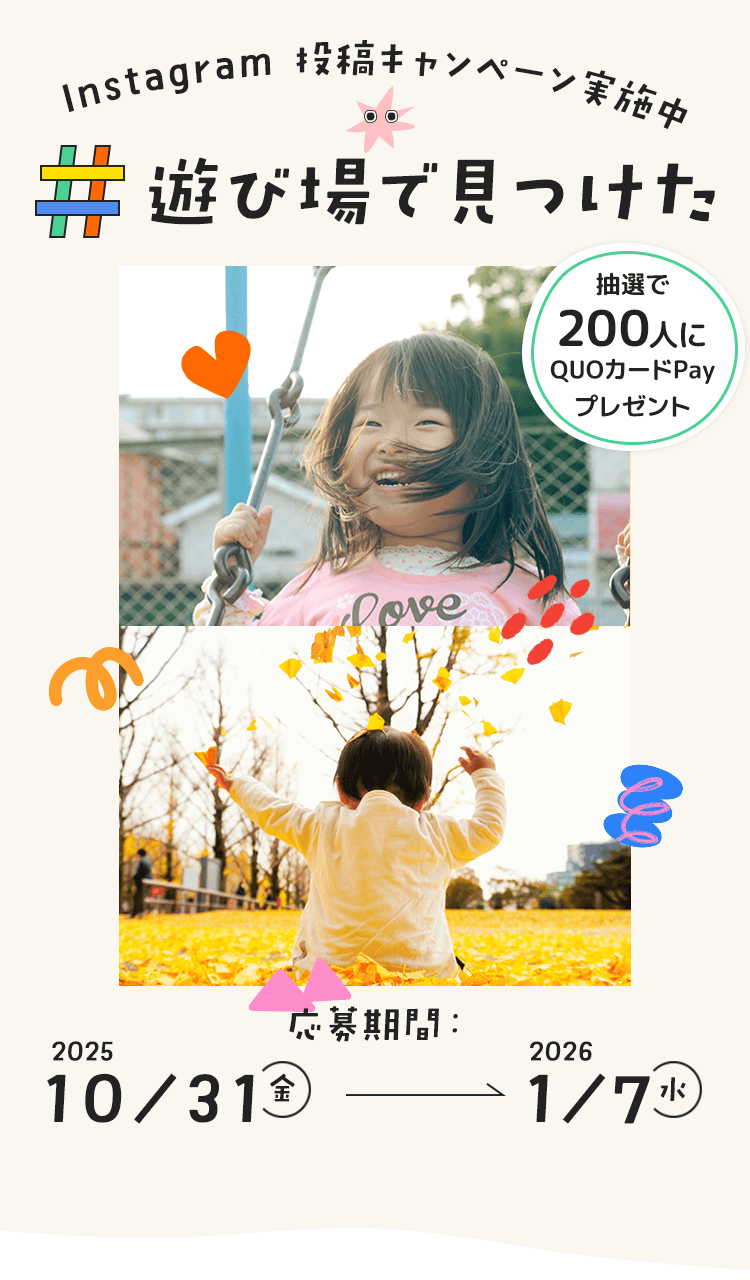 子どもが夢中で遊んでいる様子や、都内のおすすめの遊び場など、「子どもの遊びって良いな!」を伝える投稿をされた方から、抽選でQUOカードPayをプレゼント!