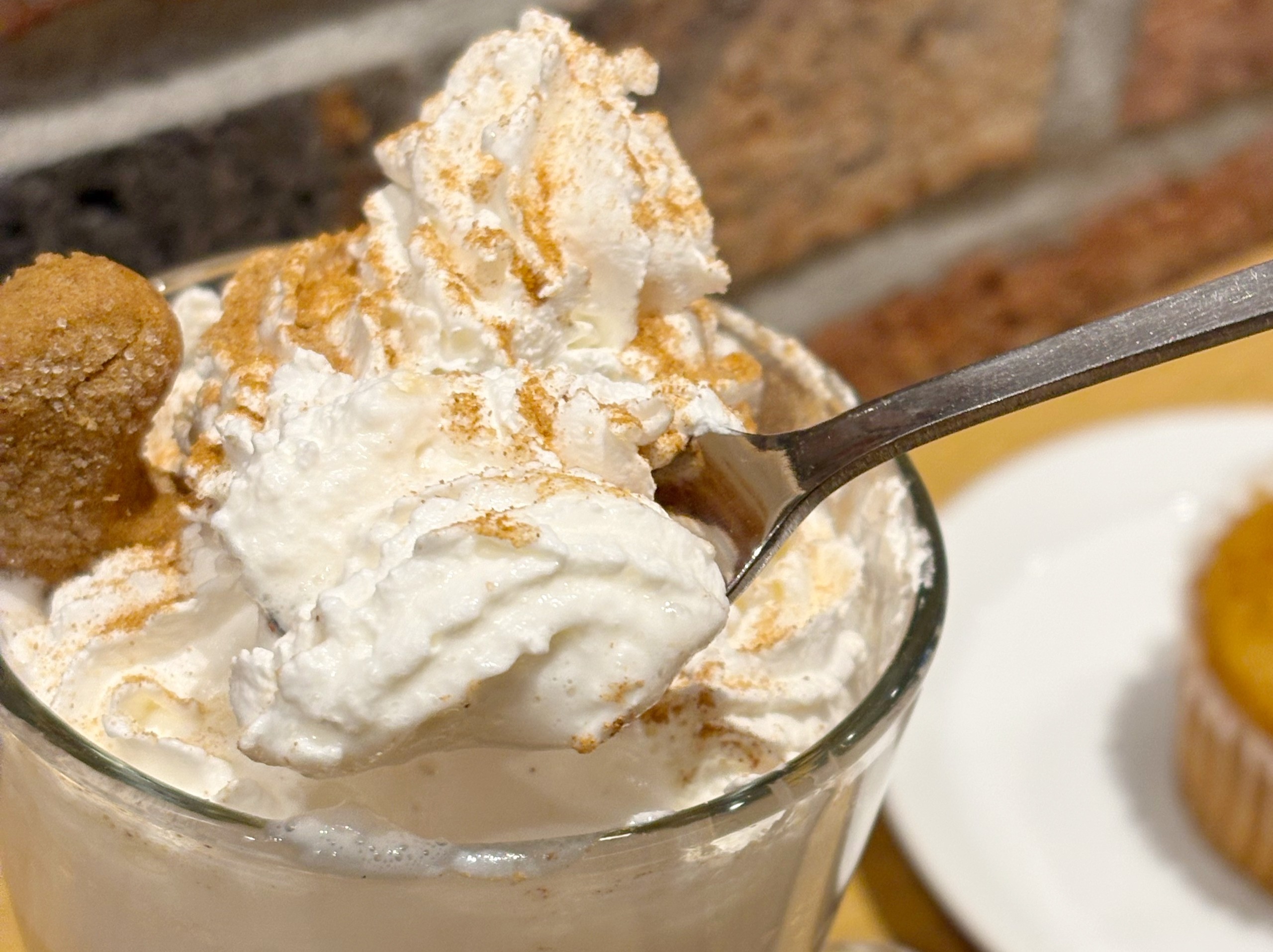 甘みはもちろんあるのですが、こだわりのエスプレッソの風味がきちんと感じられてコーヒーを飲んでいる満足感も。ジンジャーブレッドの香ばしさを閉じ込めたシロップに、ジンジャーとシナモンのスパイスがやわらかく香り、私はこれを飲むと冬が来たなぁと感じます。サクッと軽い食感と、ほんのり広がるシナモンの風味がアクセントのクッキーは、+100円でどのドリンクにもつけられますよ。