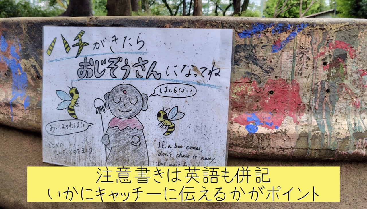 周辺には英語を話す外国人住民も多く、遊びに来る子どもたちも多国籍。園内の注意書きには日本語のほかに、英語も併記されています。