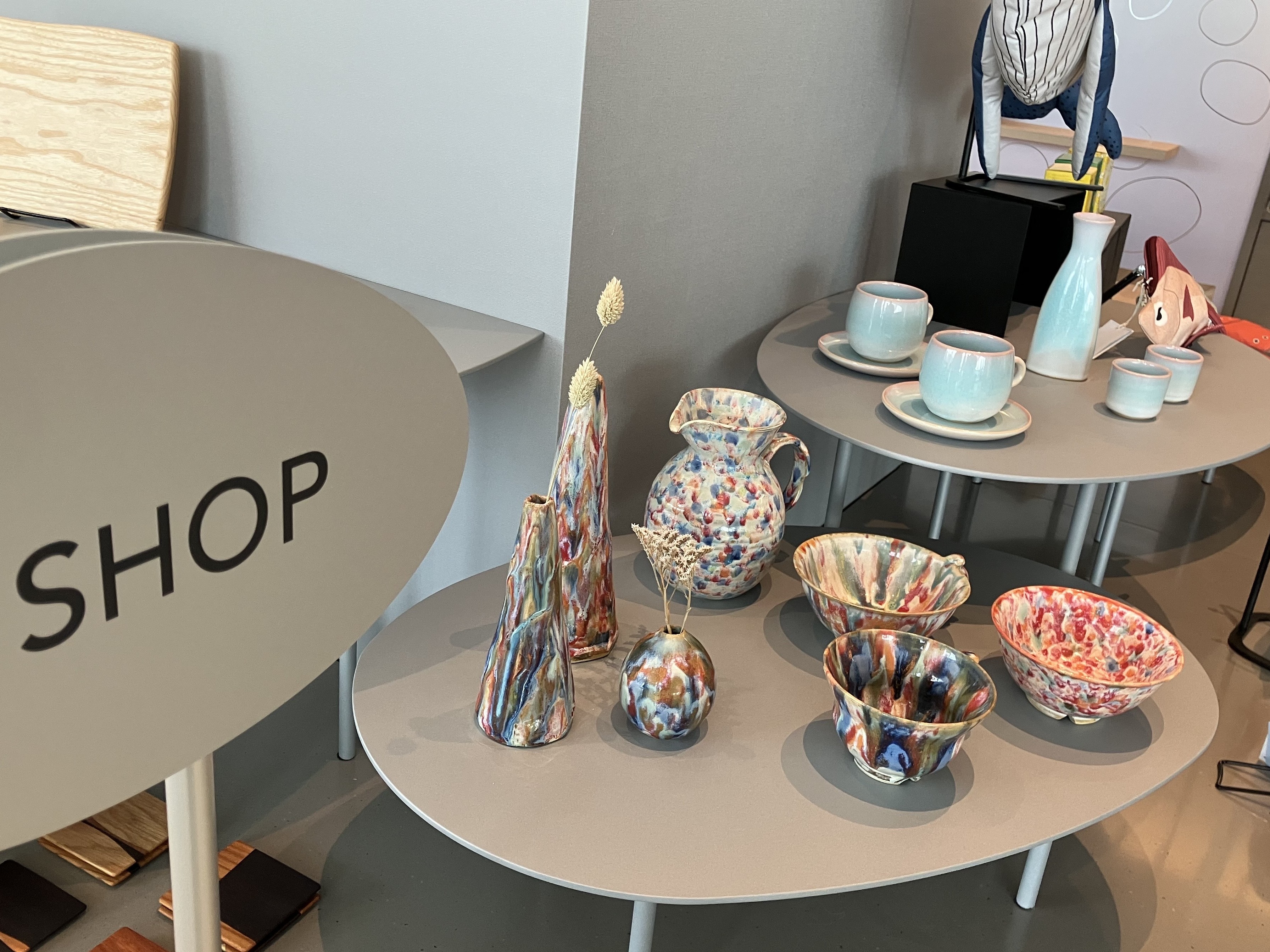 萩焼のうつわも販売されています。奥のブルーのシリーズは、関門海峡の海の色から着想を得た、同ホテルオリジナルの商品とか。