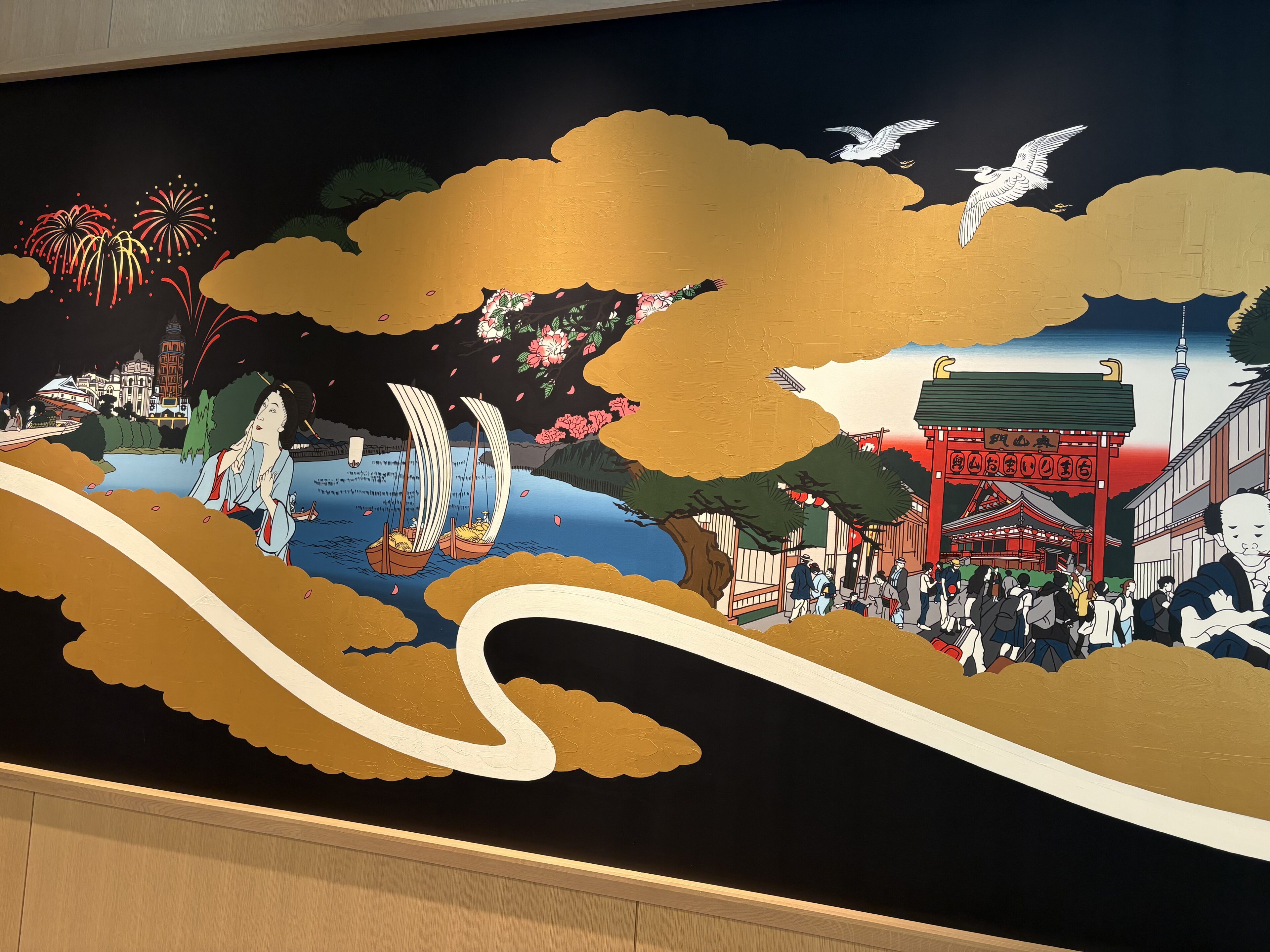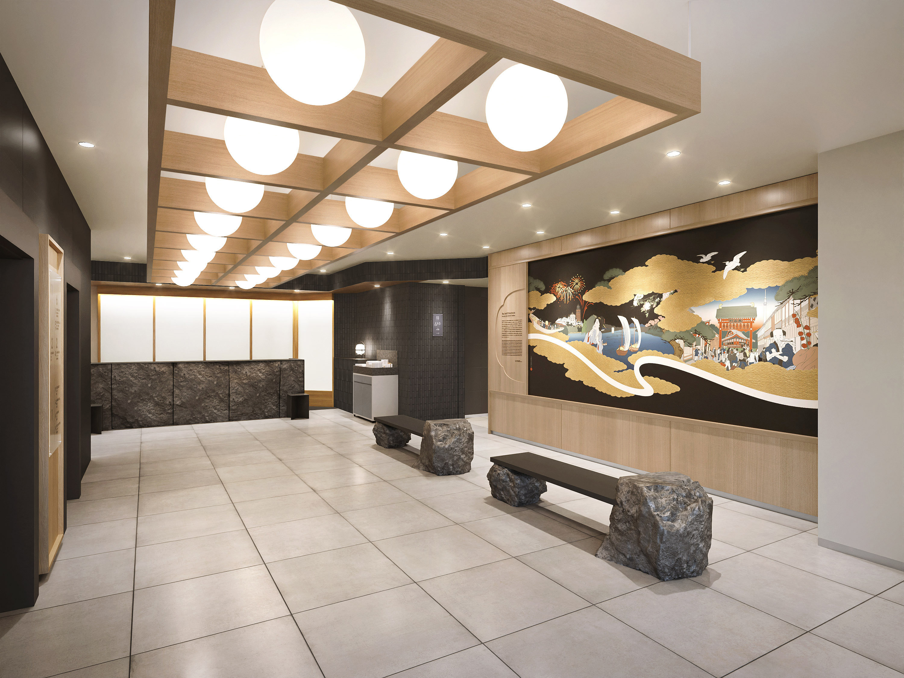 ロビーは浅草の“今と昔”を重ね合わせた「OZ-尾頭-山口佳祐氏」の絵画を中心に構成。床はモルタル風タイルで仕上げ、石で作られたベンチなど「浅草に来たなぁ」と体感できるような上質で落ち着いた空間に。