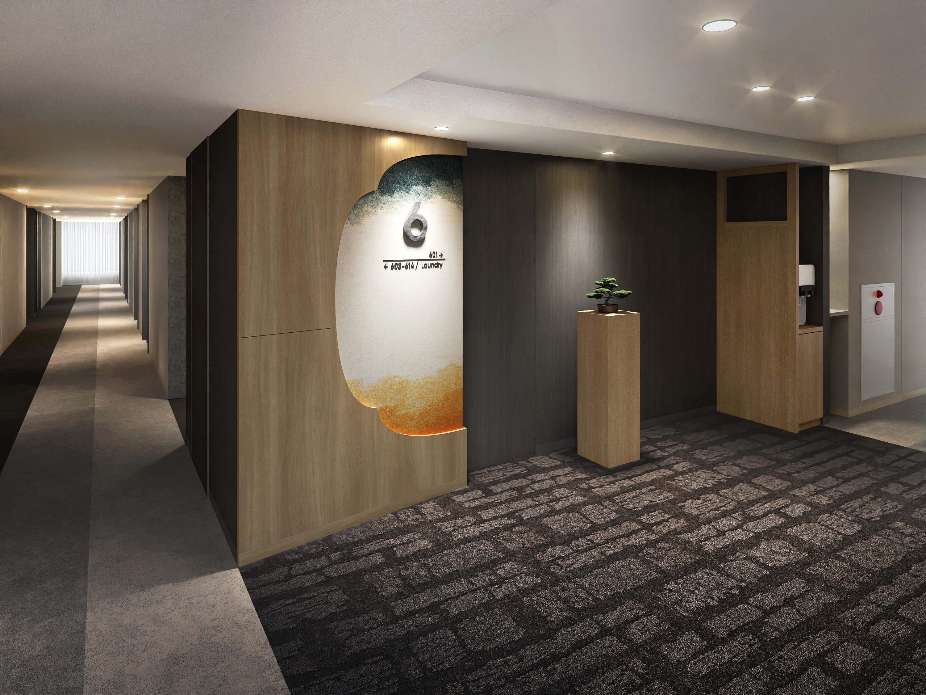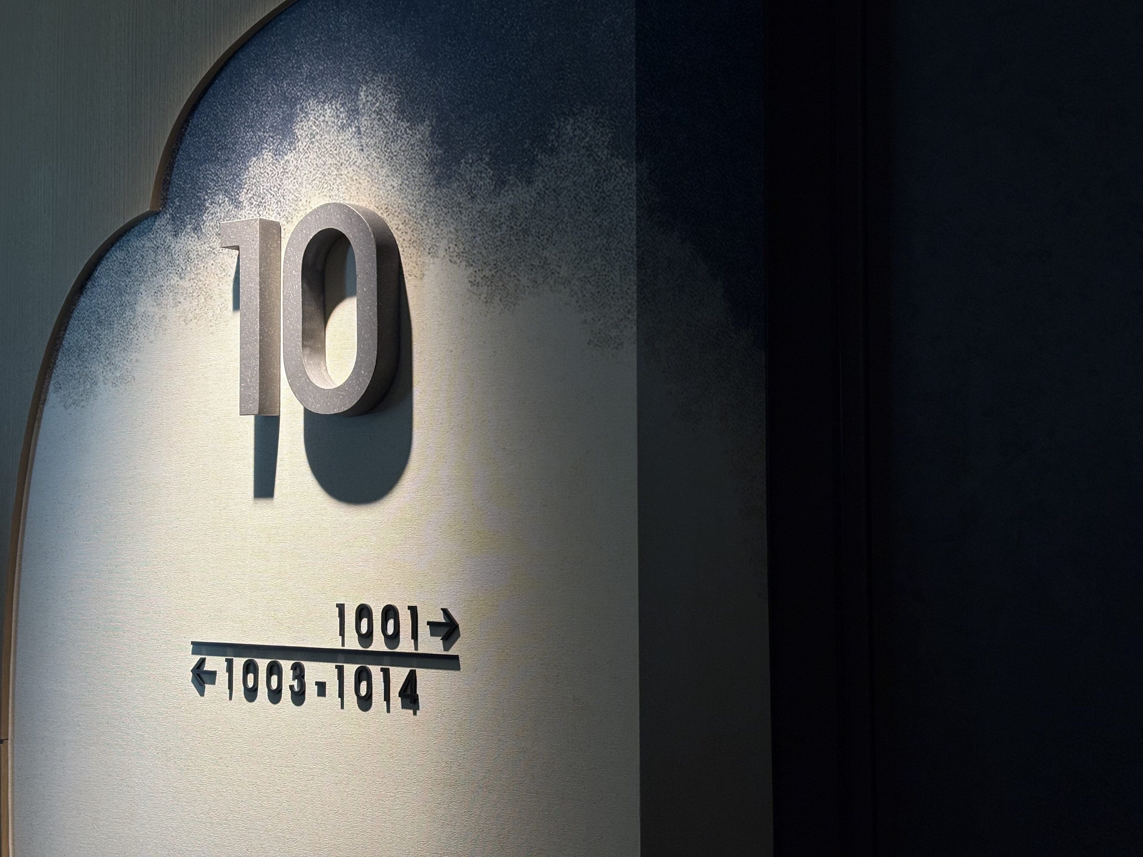 ロビーで用いた小松石を階数表示にも使用して統一感を演出。連続性のあるラグジュアリーなエレベーターホールが、客室へ向かうワクワク感を高めてくれます。