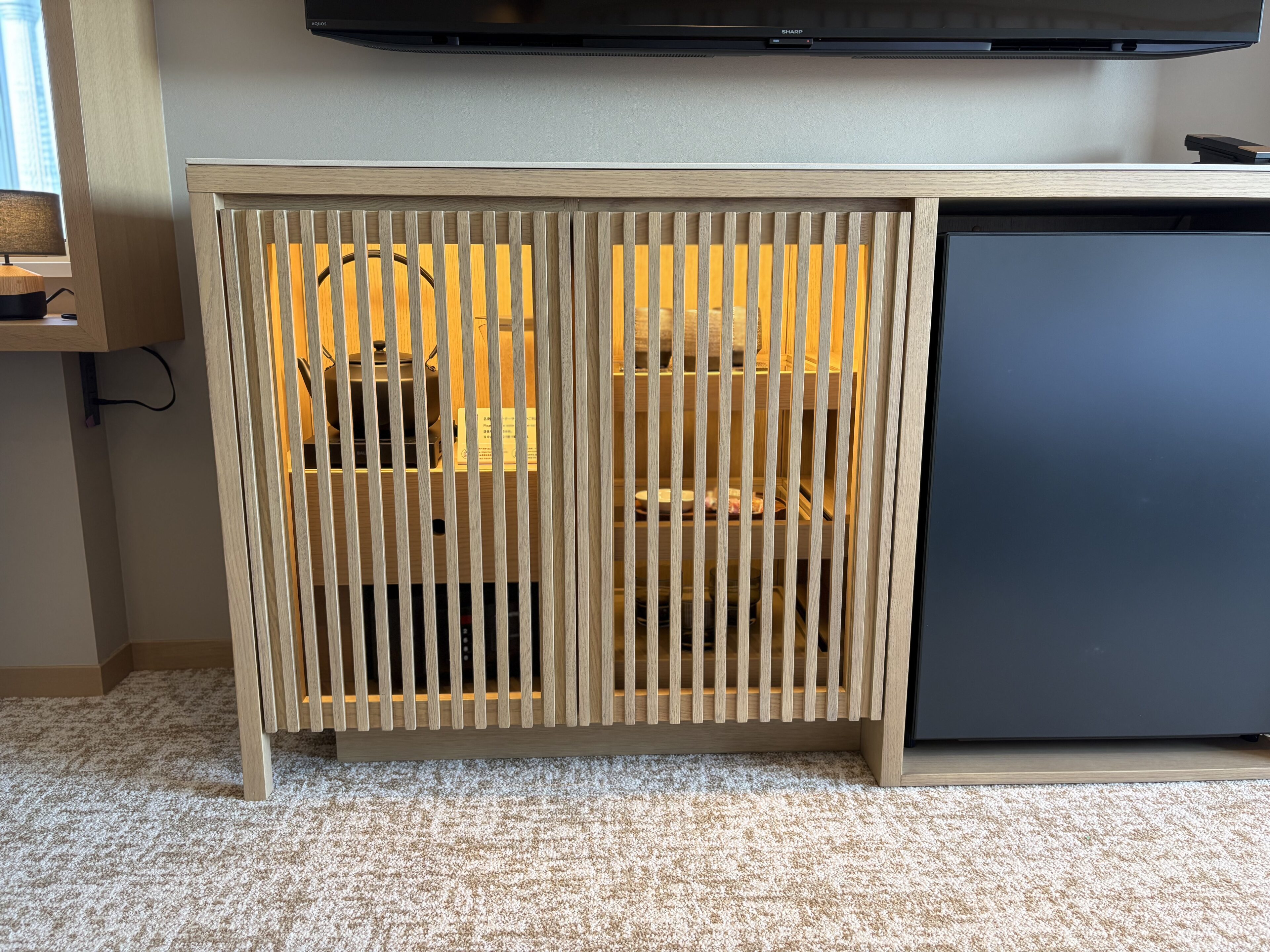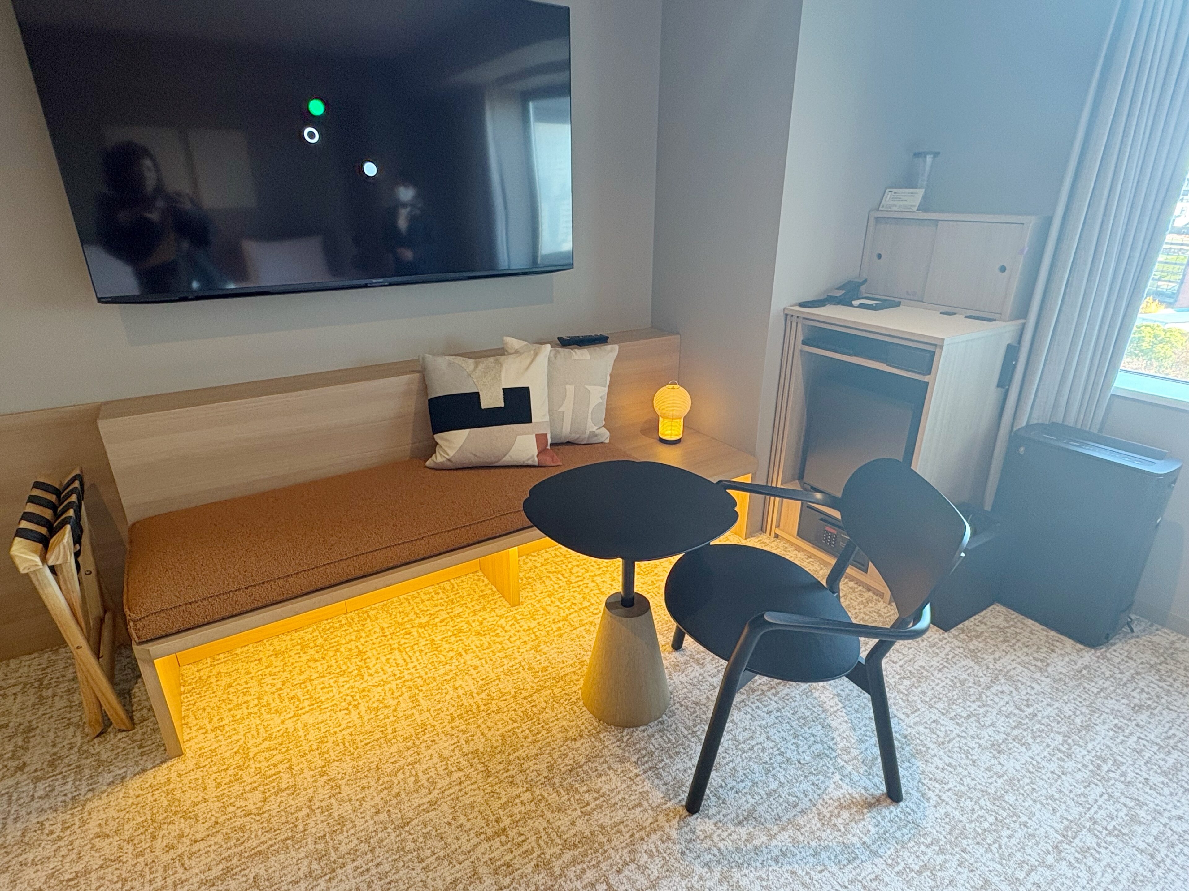 私が宿泊したのは「プレシャスツインルーム」。縁側を思わせるワイドベンチに、釘隠しの花形を天板に映したサイドテーブルのスペースがあるお部屋です。ワイドベンチの下には、スーツケースなどの荷物を置けるようになっていて、空間利用も工夫されていました。