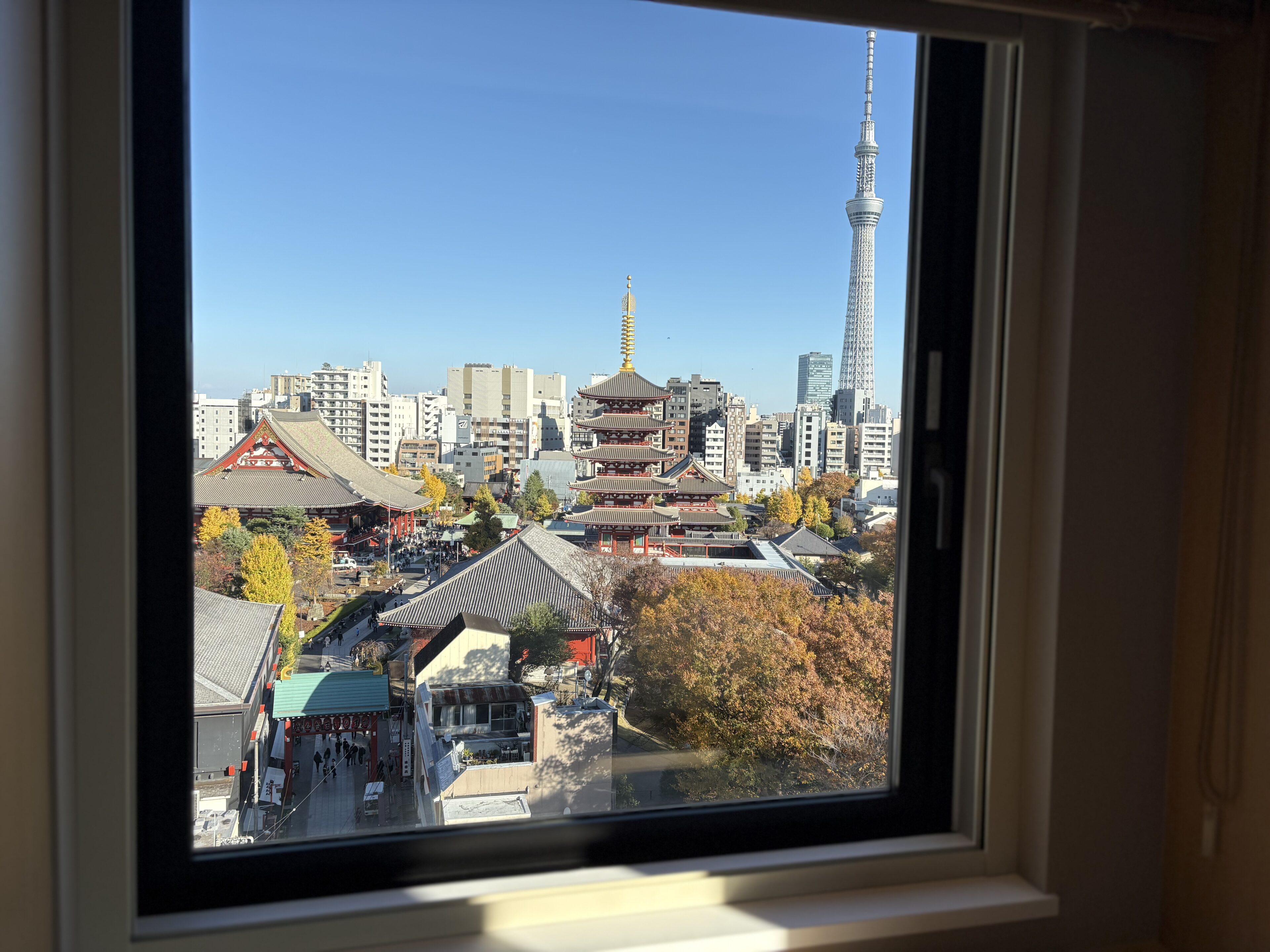 景観を楽しみたい場合は、7階以上の〈プレシャス〉がつく客室がおすすめ。浅草寺と五重塔、東京スカイツリー®を望む浅草の借景を楽しめます。