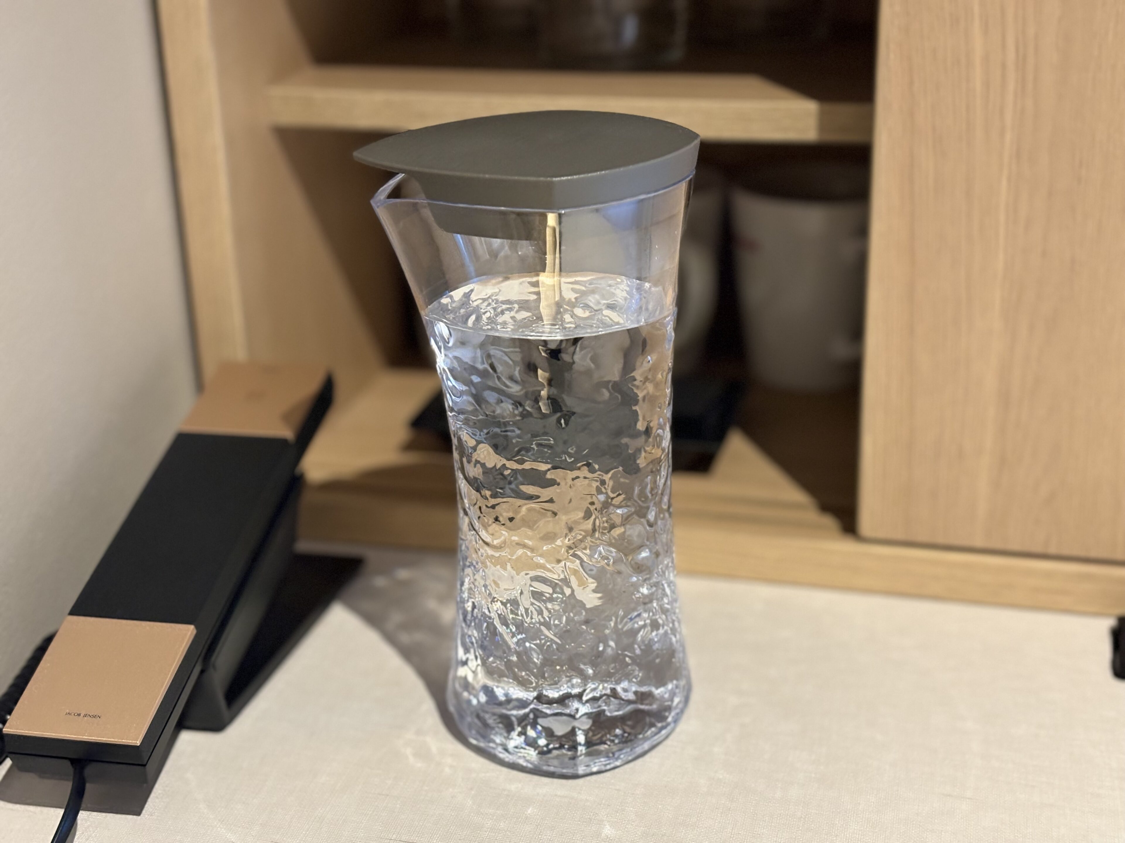 ホテルでは様々なエコな取組みも。お水は各階のエレベーターホールに設置されているウォーターサーバーからいつでも、好きなだけ持ってくることが可能。アメニティーはロビーから自分が必要なものだけ持参するスタイルです。