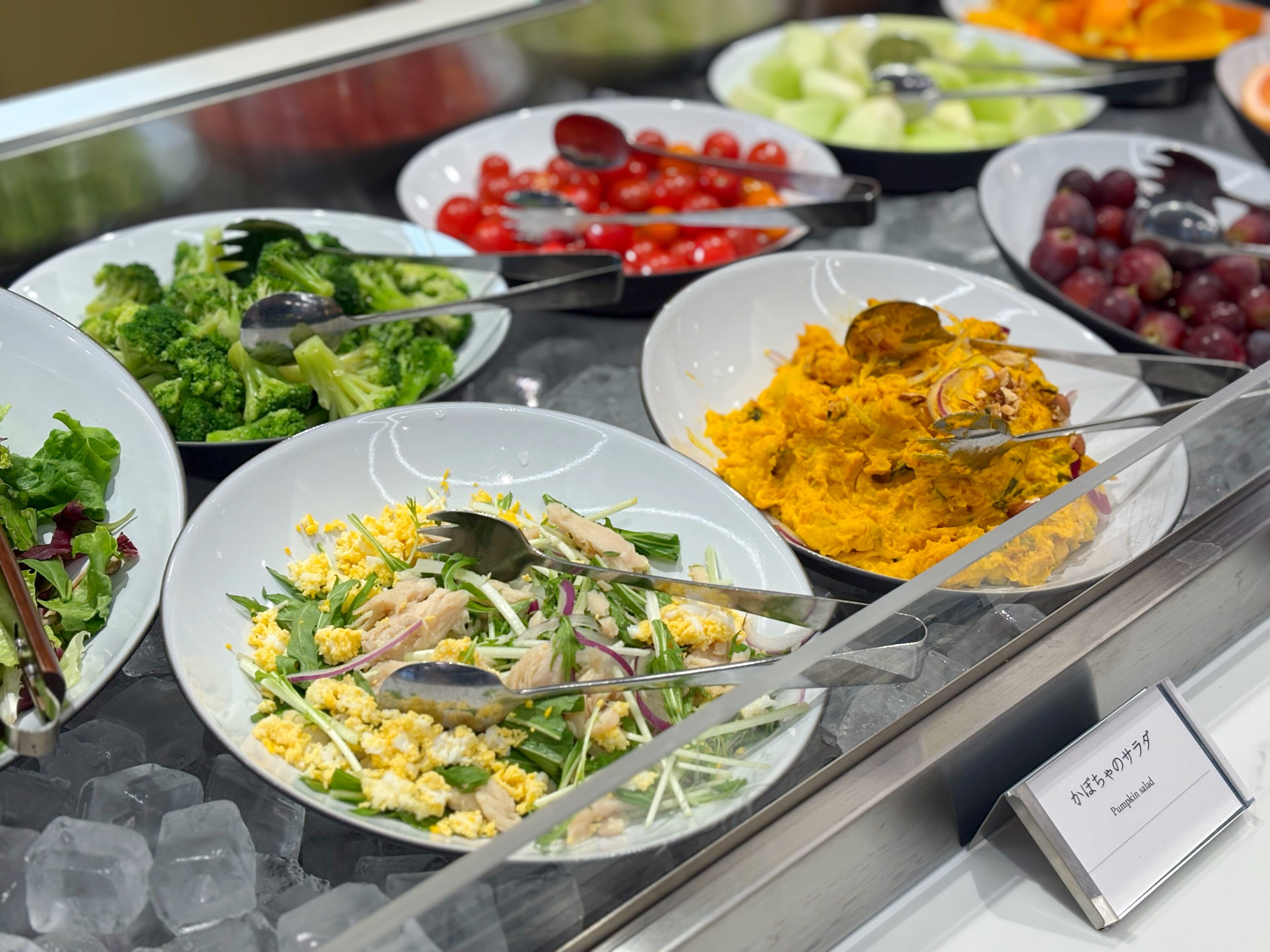 サラダ、フルーツ、温かいパンなど、多様な国や地域から訪れる人々にも満足度が高いラインアップに。