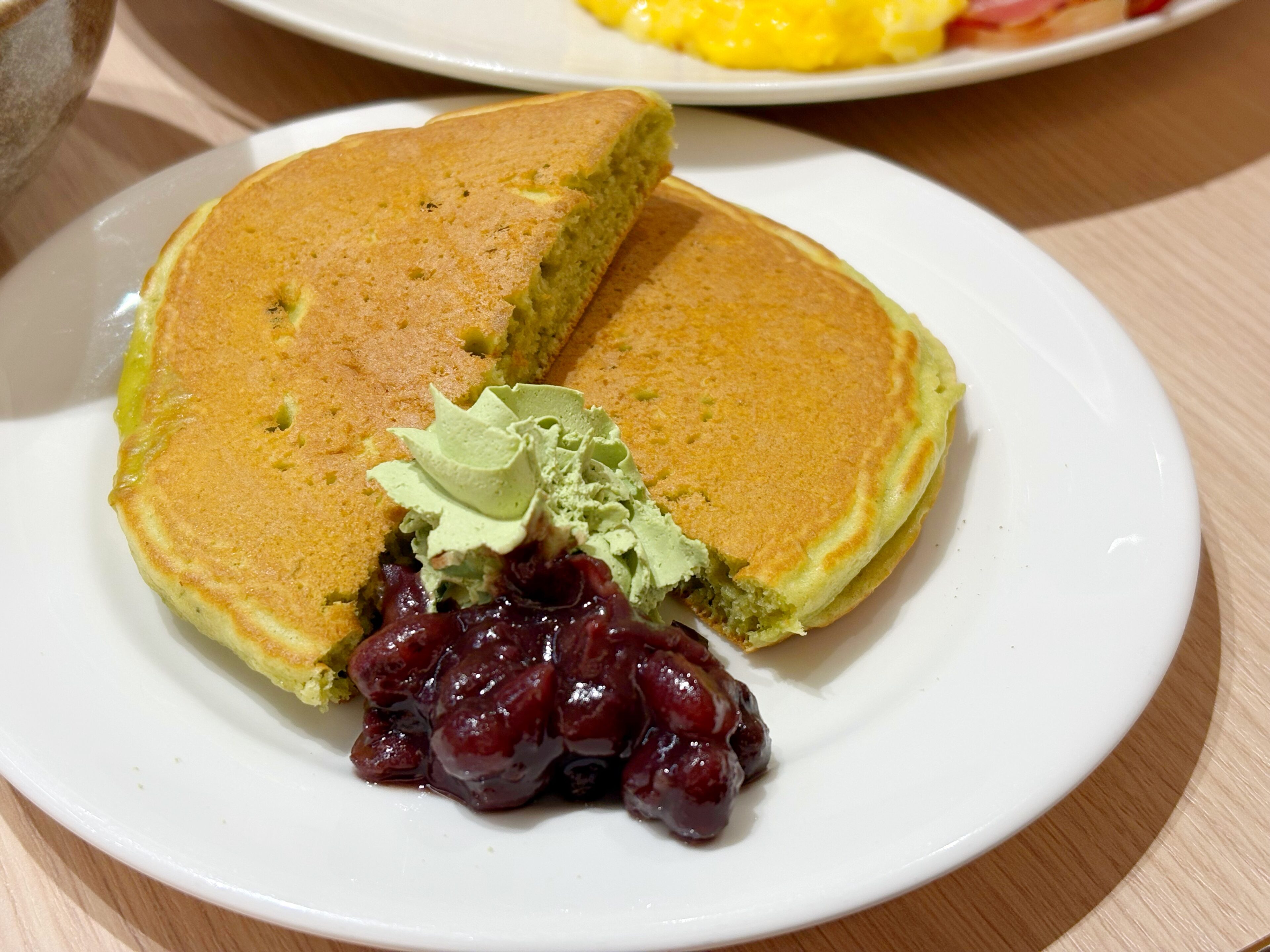 注文後に、目の前で作ってくれるメニューは3種類。中でもおすすめは和を感じる「抹茶パンケーキ」です。そのほか、インバウンドに人気のラーメンや、朝食にぴったりなベーコンエッグ。