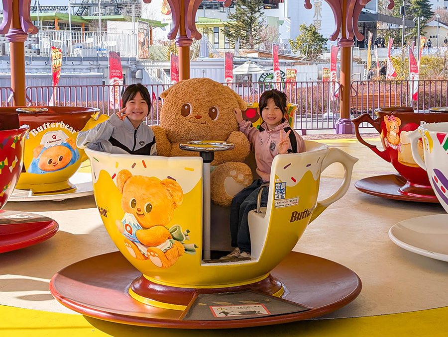 たとえば、「Par-tea Cup(パーティーカップ)」というアトラクション。遊園地によくあるカップがぐるぐる回転するタイプの乗り物だが、Butterbear(バターベア)とコラボしていて嬉しくなった。