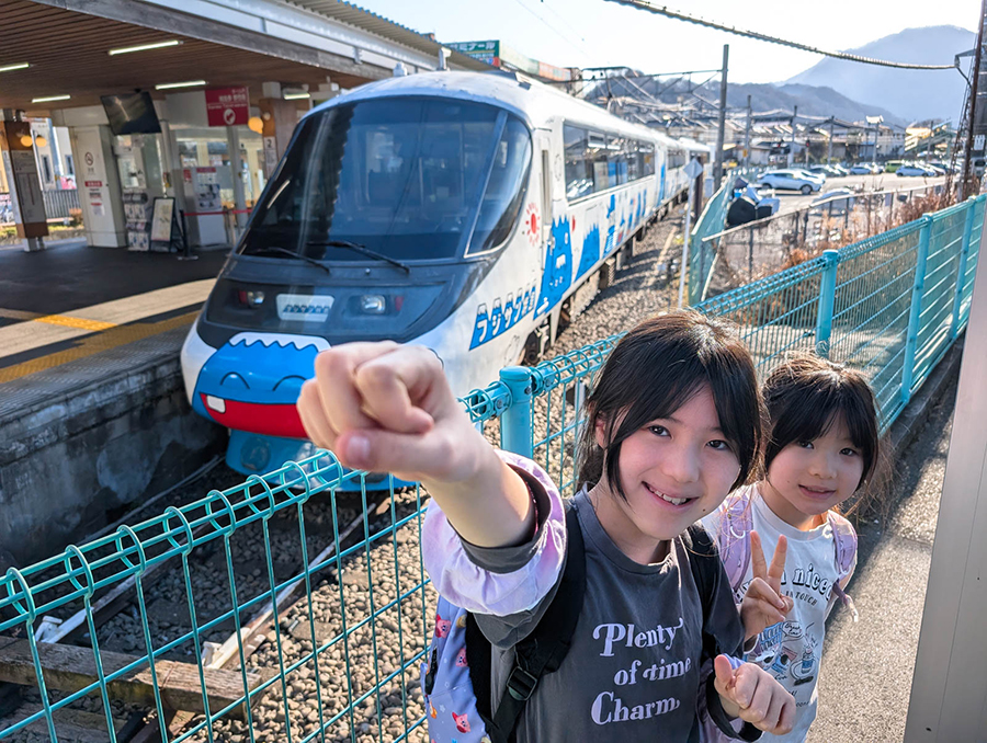 特急かいじを大月駅で降りて、富士急行に乗り換えた。車体にデフォルメされた富士山のキャラクターが描かれている、ユニークな電車を前にして娘たちが目を輝かせた。その名も「フジサン特急」という。